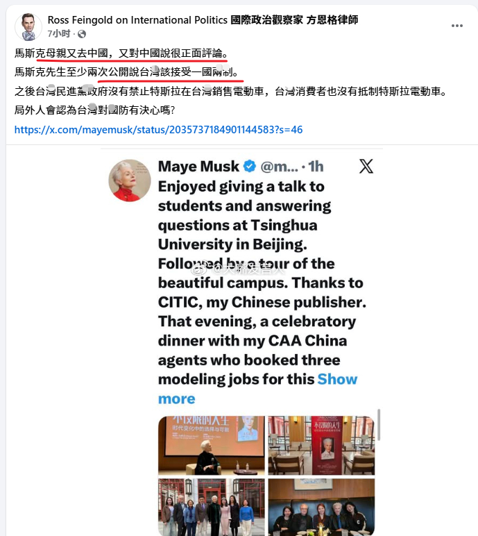 马斯克老妈到中国访问(图4起),引起居住在台北的前美国共和档亚太区小头领方恩格的焦虑(图1)方恩格焦虑的原因是,马斯克多次表达湾湾应该接受一G两Z,但湾湾现在当政的绿蛙集团不敢对此反对并抵制马斯克的特斯拉汽车~~以前我说过,湾湾媒体人会时不时暴露自己,不只是赖某谦,还有郭正亮,郭就对马斯克说湾湾应该接受一G两Z,表达过反对、愤怒(图2),并造谣“马斯克人品差、在美国说话没人听”就这类货色,一些大陆网民还对他十分友好,还买齐8种苹果去接机欢迎(图3),实在是~~不知道是善良还是傻~~注意用脑卫生,本周做什么都顺的星座 ,热点观点