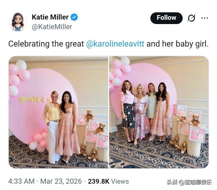 卡罗琳·莱维特的迎婴派对,她二胎怀的是个女孩。 白宫新闻秘书穿着一条紫粉色连衣裙