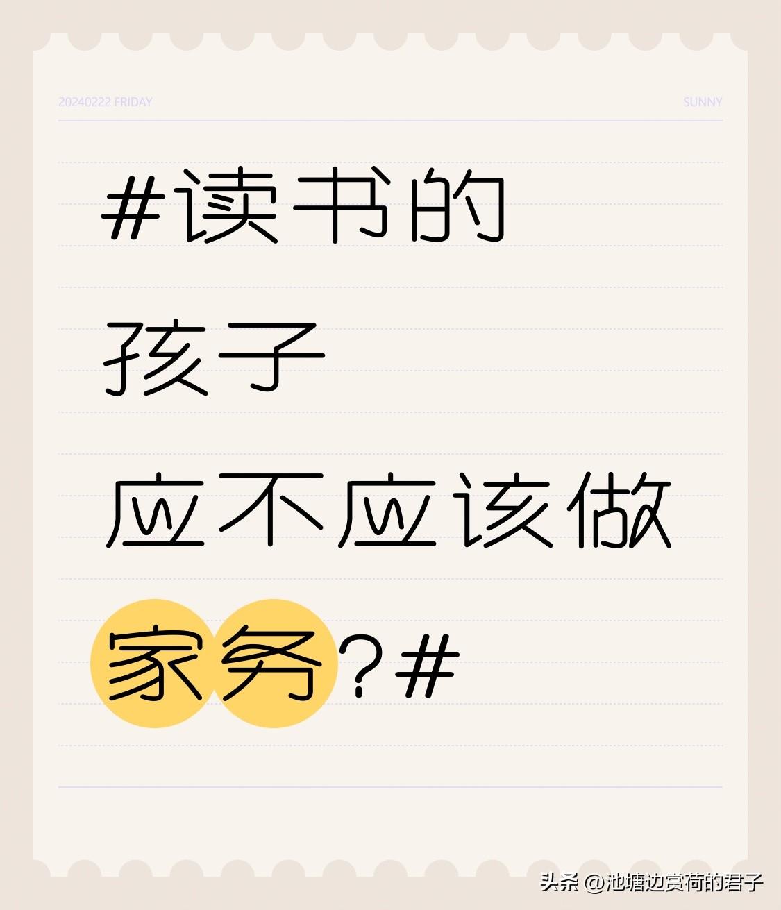 读书的孩子应不应该做家务? 读书的孩子当然应该做家务!很多家长觉得孩子只要学习好就行,家务不用管,这其实是在坑娃。我身边就有例子,有个孩子被家长宠得啥家务都不干,上大学后连衣服都洗不利索,自理能力超差。 而会做家务的孩子,往往更有出息。像10岁的乐乐,每天做点家务,整理书包、擦桌子啥的,做事有条理,专注力和责任感都强。 不同年龄段孩子能做不同家务,幼儿园孩子收收玩具,小学孩子擦擦桌子,每天花10 - 20分钟就行。家长别再说“只管学习”这种话,让孩子做家务,是在培养他们的人生底气!