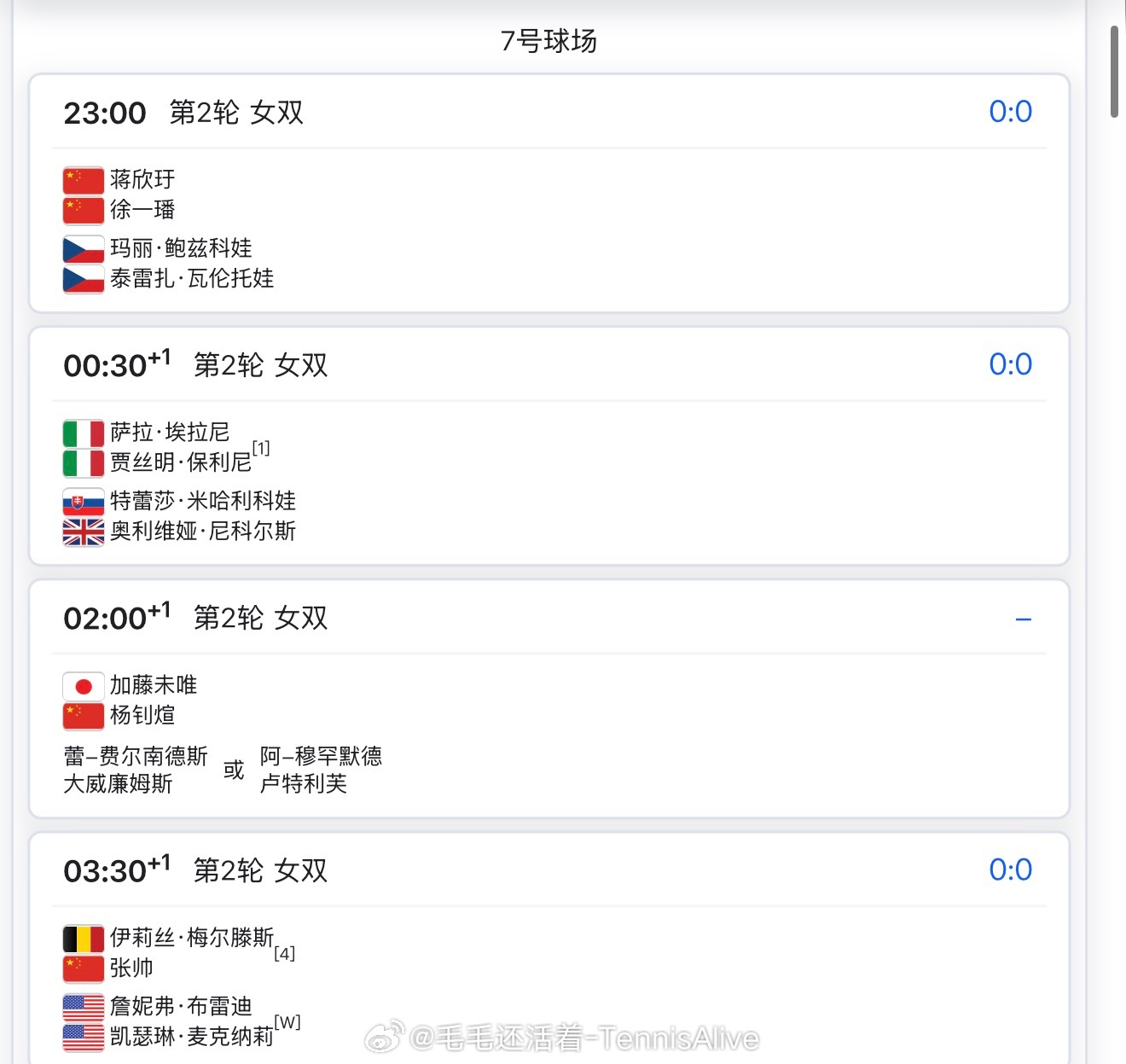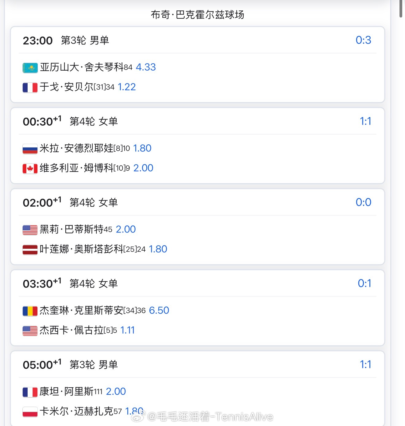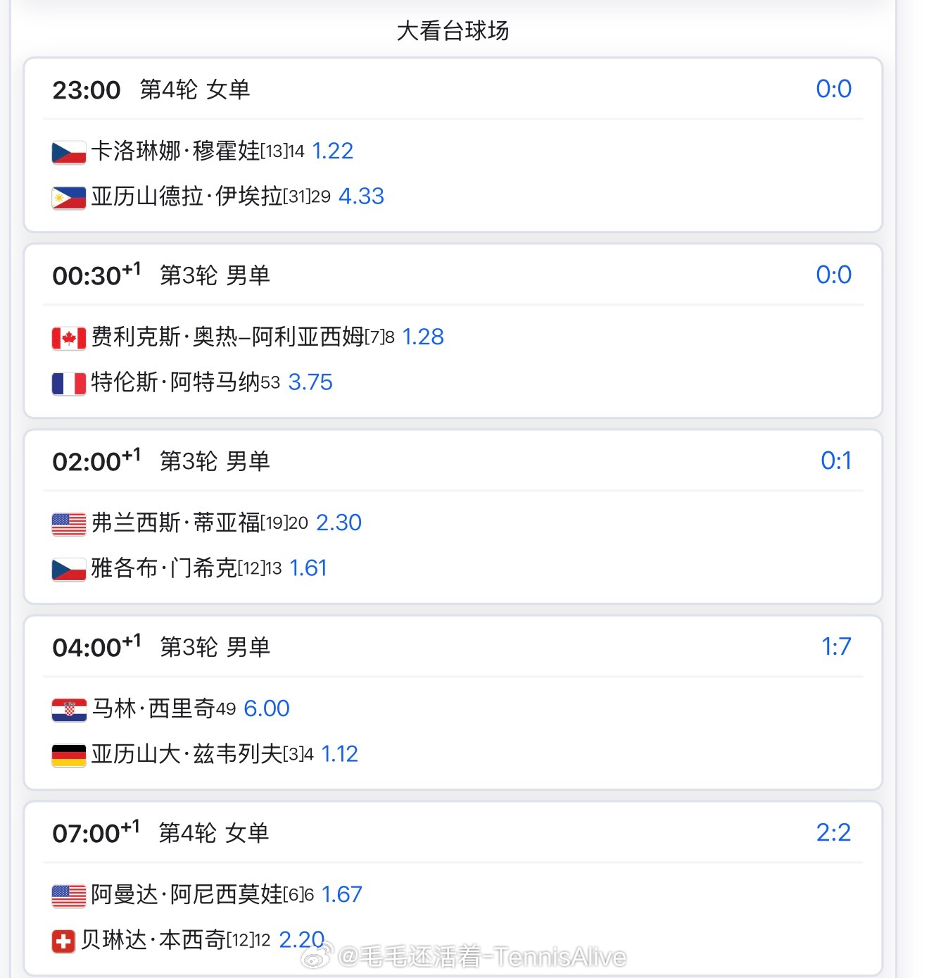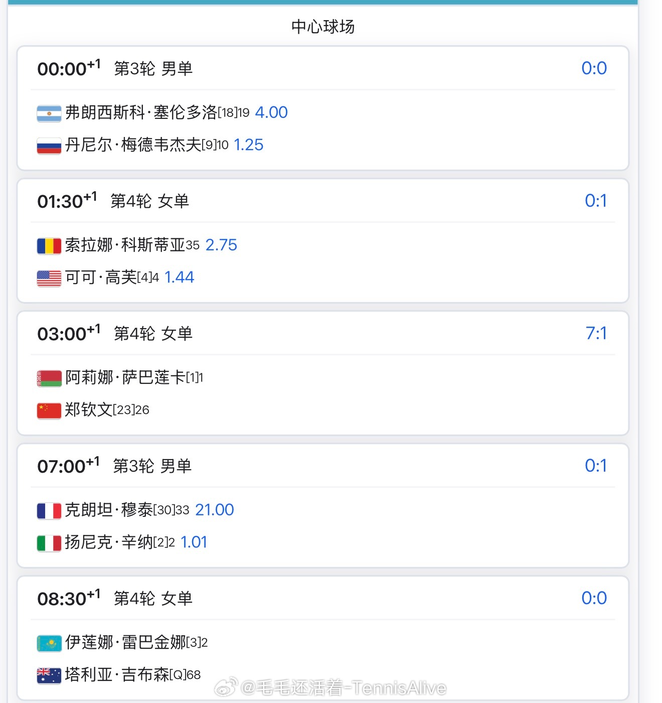 23:00埃拉vs穆霍娃1:00安德列娃vs姆博科2:00高芙vs科斯蒂亚+4:00郑钦文vs萨巴伦卡 +7:00辛纳vs穆泰+8:30莱巴金娜vs吉布森