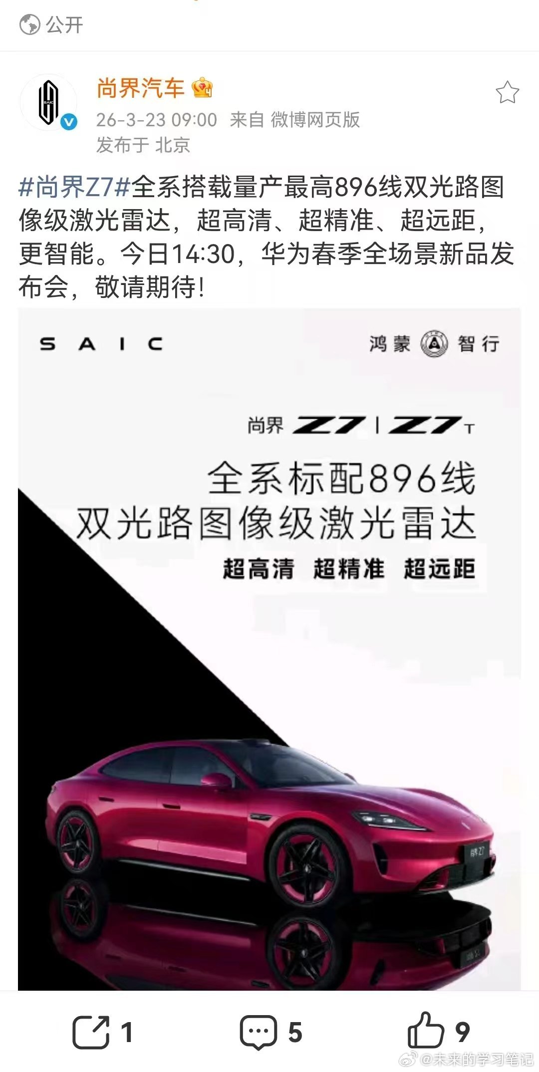 尚界z7t尚界z7 全系搭载896线激光雷达,还有5颗4D毫米波雷达,辅助驾驶和