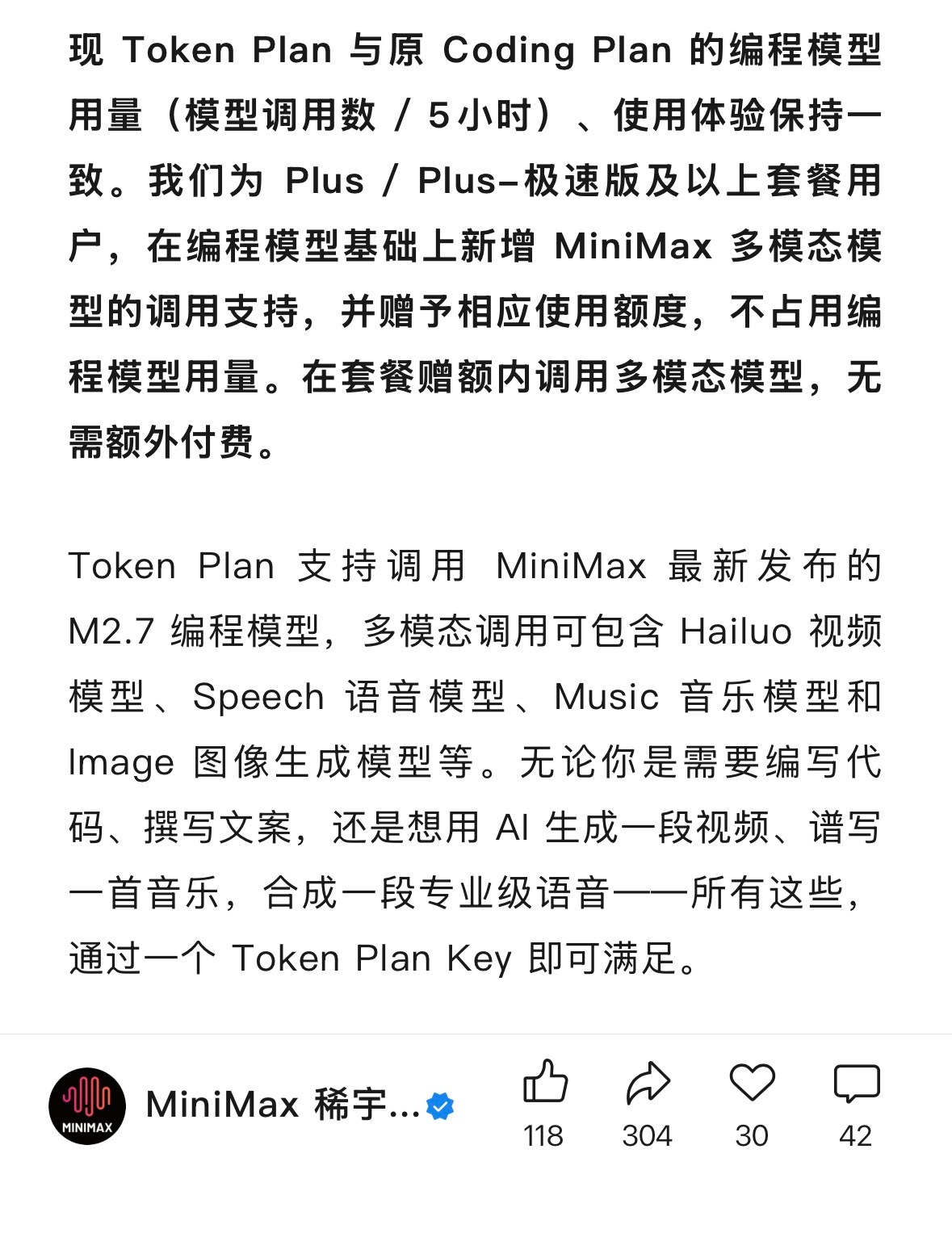 这个真厉害了,之前都是 coding plan,MiniMax 给整了个旗下所有模型的 token plan,包括 M2.7、 Hailuo 视频模型、Speech 语音模型、Music 音乐模型和 Image 图像生成模型等。
