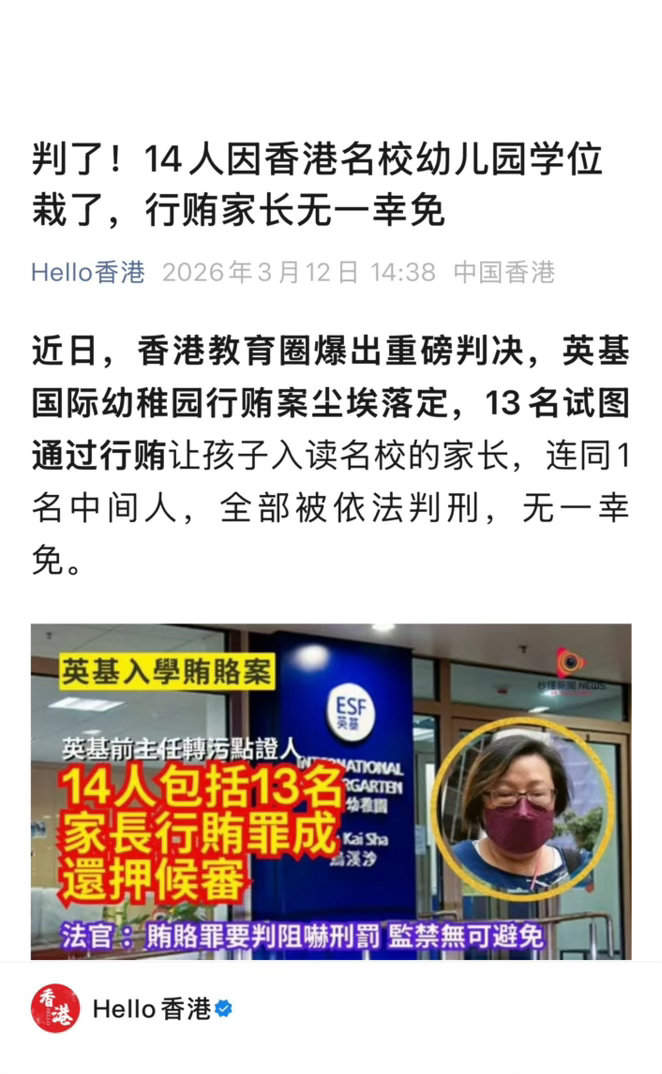 近日,香港教育圈爆出重磅判决,英基国际幼稚园行贿案尘埃落定,13名试图通过行贿让孩子入读名校的家长,连同1名中间人,全部被依法判刑,无一幸免。