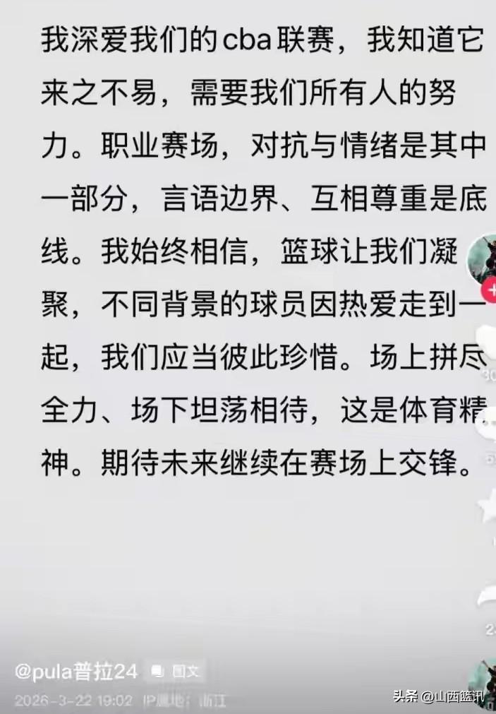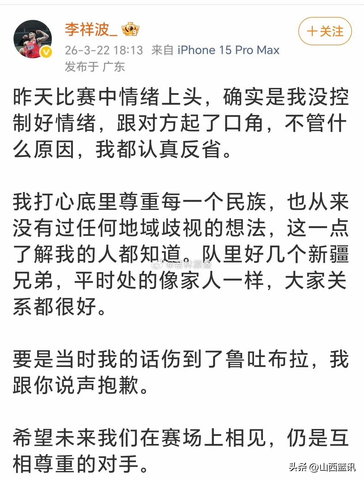 CBA联盟放过了皮特森?鲁吐布拉也放过了李祥波!当球迷希望CBA联盟对福建晋江文旅男篮外援皮特森数钱的动作做出严厉处罚之际,时至今日已经过去了36个小时,没有见CBA联盟的处罚公告,于是球迷猜测CBA官方是不是就此放过了皮特森?毕竟,迪亚洛上赛季有过类似动作收到过罚款单。于是球迷想:以后数钱别在比赛进行中数钱,要数钱就在比赛结束退场时进行,这样数钱与比赛无关,球迷该不该一笑而过呢? 当“回去打馕去吧”的言论被传出来之后,鲁吐布拉等人就没准备放过李祥波,李祥波不给个说法,鲁吐布拉们就要干下去,他们要把李祥波的言论放在“56个民族团结如一家”的高度上说事。于是,李祥波在压力下说“要是当时我的话伤到了鲁吐布拉,我跟你说声抱歉”。请注意是“抱歉”而非“道歉”。这个“抱歉”,表达的是内心愧疚不安,“没有控制好情绪”,把问题划分为轻微失礼和打扰的程度,仅仅是轻中度的错误,并不是比较严重的错误性质。鲁吐布拉也是热血汉子,看到李祥波的声明意思心柔下来了,但是也表达出了“语言边界、相互尊重是底线”的原则立场,“期待未来继续在赛场上交锋”。这样看来,鲁吐布拉放过了李祥波,不再就此事做过多纠缠,一门心思打好比赛。 世间本无事,庸人自扰之!凡事太较真也是伤身伤心伤肝的事情。风轻云淡一点的好!包括球迷也是,较什么真?