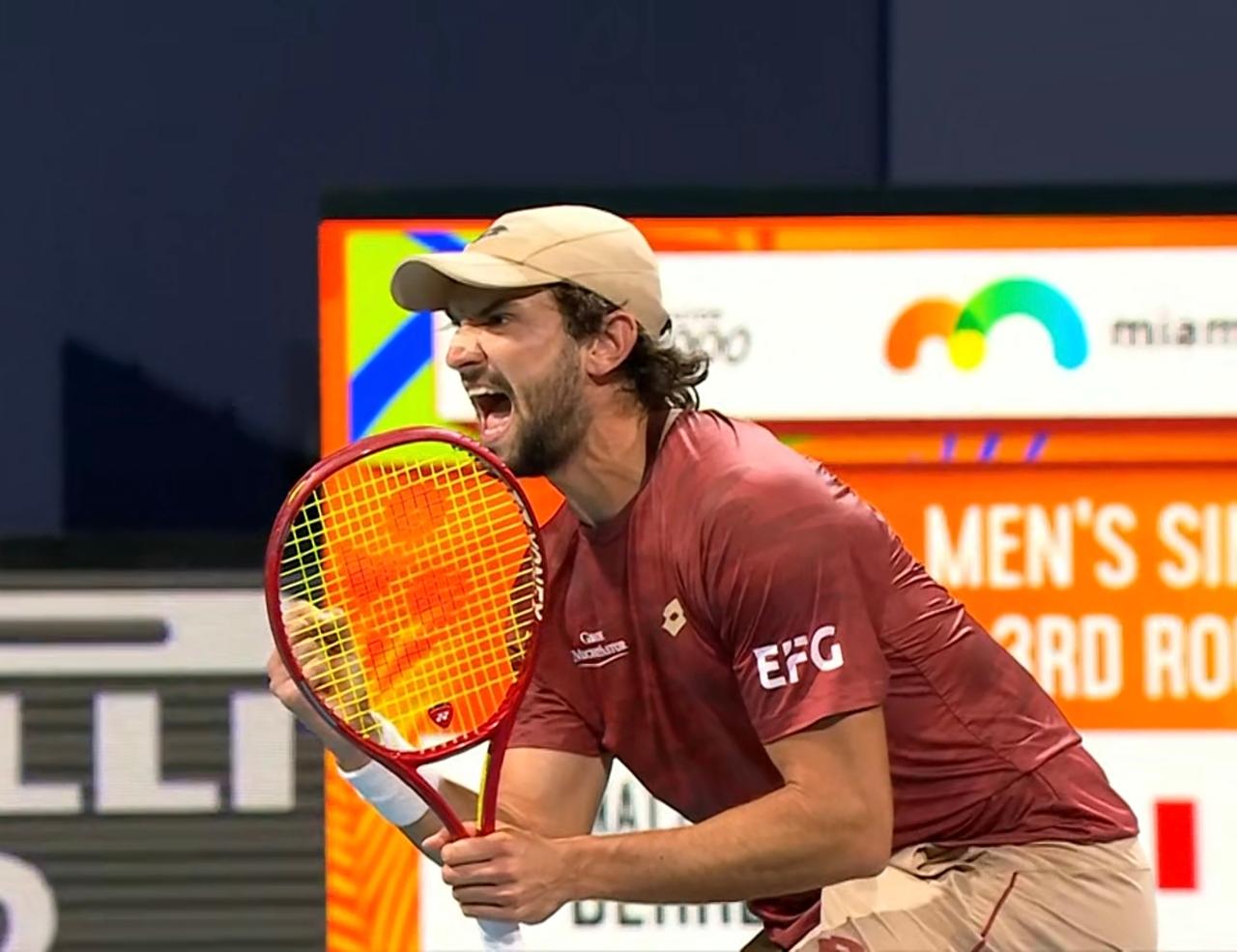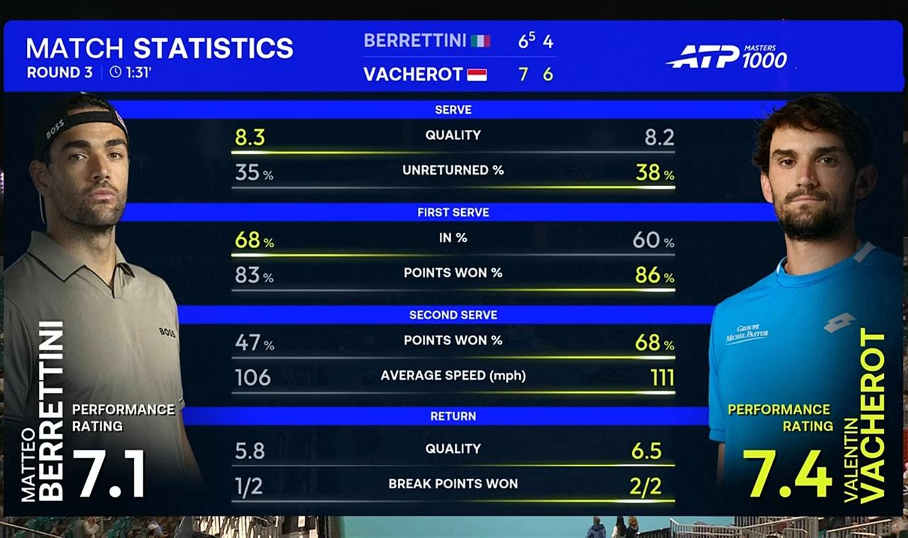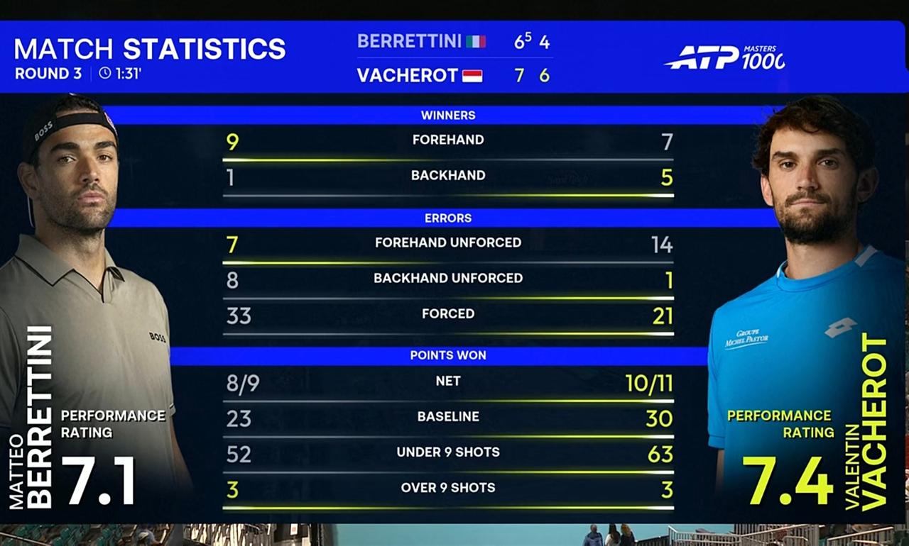 表弟瓦舍罗迈阿密大师赛第三轮完胜贝雷蒂尼,晋级16强 北京时间2026年3月23日上午,迈阿密大师赛第三轮,表弟瓦舍罗对阵贝雷蒂尼。 结果,耗时1小时31分钟,表弟瓦舍罗以2:0的比分完胜贝雷蒂尼,晋级16强。 具体比分为7:6(5)、6:4。 这场比赛,表弟瓦舍罗延续了一贯的硬朗作风,击球犀利,极具攻击力。 整场比赛,表弟瓦舍罗共轰出4记ACE,比对手少2记;发出2个双误,与对手持平;一发得分率高达86.49%,比对手高出4个多百分点;二发得分率高达68.00%,比对手高近21个百分点;共拿到2个破发点,与对手持平;成功破发2次,比对手多1次;总得分66分,比对手多12分。 恭喜表弟瓦舍罗!