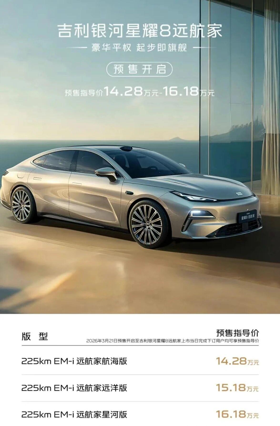 吉利银河星耀8远航家开启预售,中大型轿车市场又添猛将! 3月21日,吉利银河星耀8远航家开启预售,预售价14.28万元起,推出3款车型。新车在外观配色、配置、续航等方面升级,新增“丹霞矿”等配色,搭载27颗感知硬件,CLTC纯电续航225km。吉利银河星耀8远航家预售