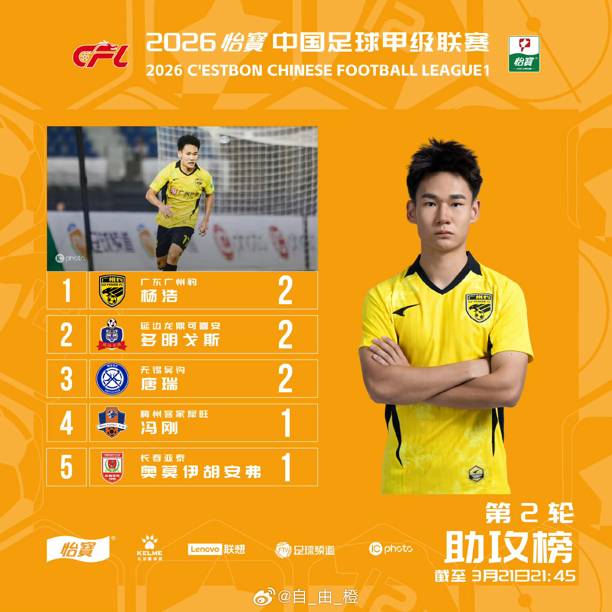 外租小将唐瑞领跑中甲射手榜并在助攻榜位列第三。