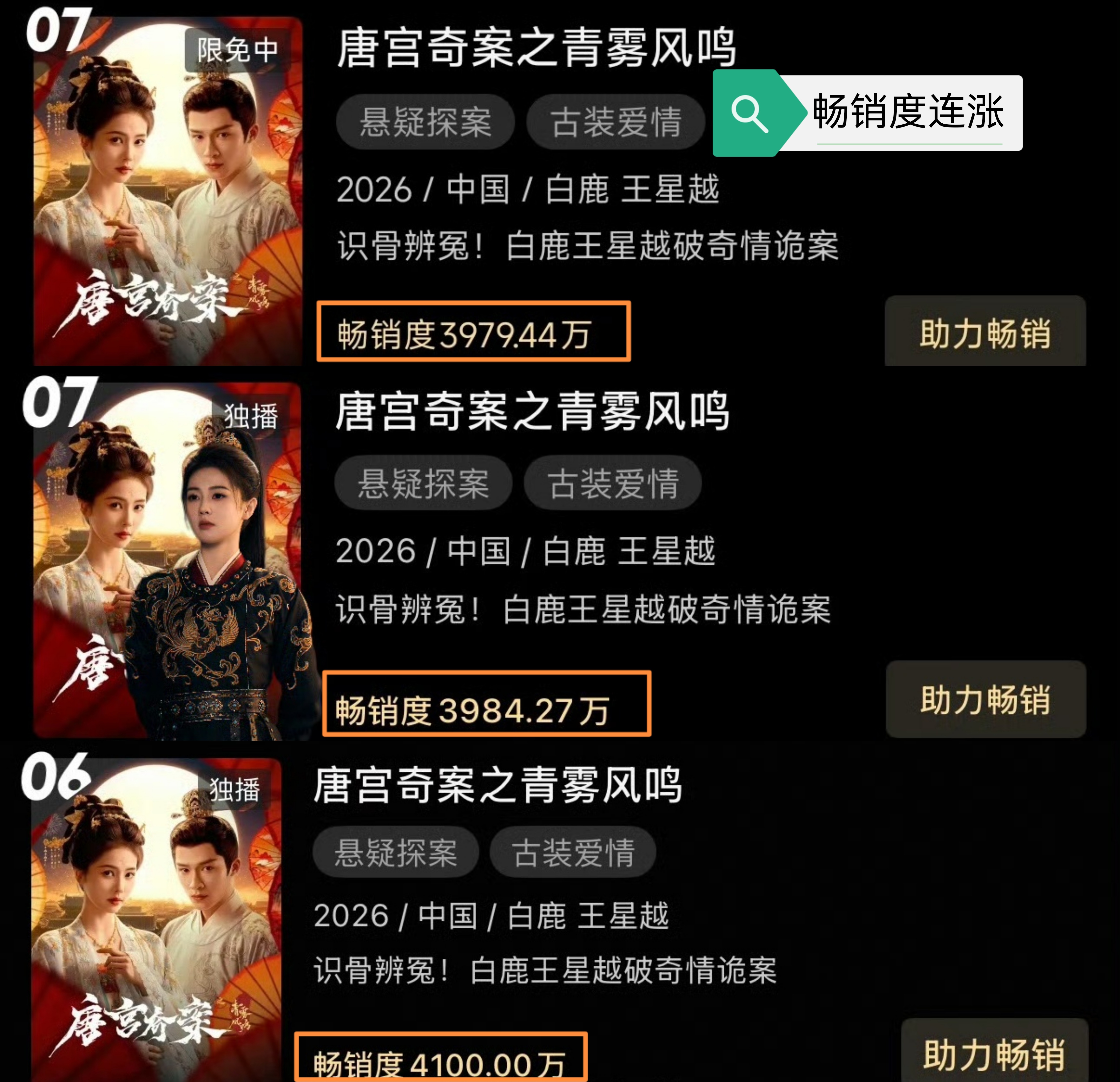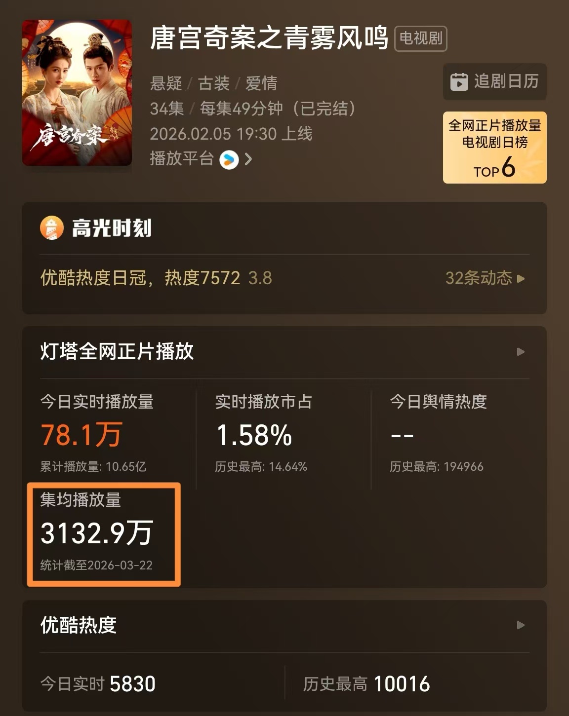 上线47天,《唐宫奇案》拖出一条漂亮的长尾巴:👖畅销度实现连涨,现已达榜单第六位,拉新效应不断发酵;集均播放量在跃过3000万之后,不断上升,已升至3132.9万,越来越多人开始二刷、三刷;在今天的全网正片播放量榜单中,上线47天的《唐宫奇案》,列第6位,追《唐宫奇案》没有完成时,都是正在进行时。