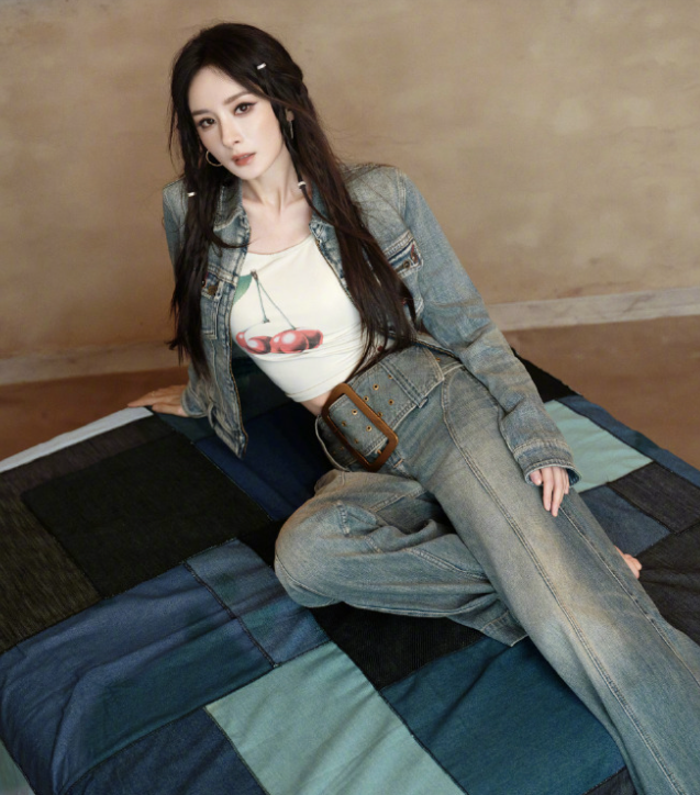 杨幂里面穿白色紧身T恤 下身搭配做旧风格的牛仔裤,让她秀出了苗条的细腰,还展现出了完美的身材比例 她脚踩白色尖头高跟鞋,凸显出了满满的犀利感,效果极为出众 杨幂外面套着复古风牛仔外套,增添了一种硬朗干练范儿,看起来非常的好 杨幂留着超美的披肩长发,还画着超美的浓妆,确实是很有樱桃少女的感觉