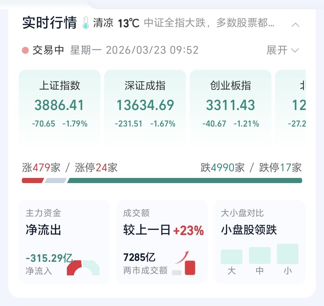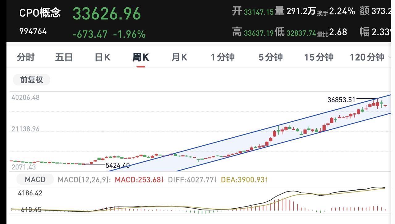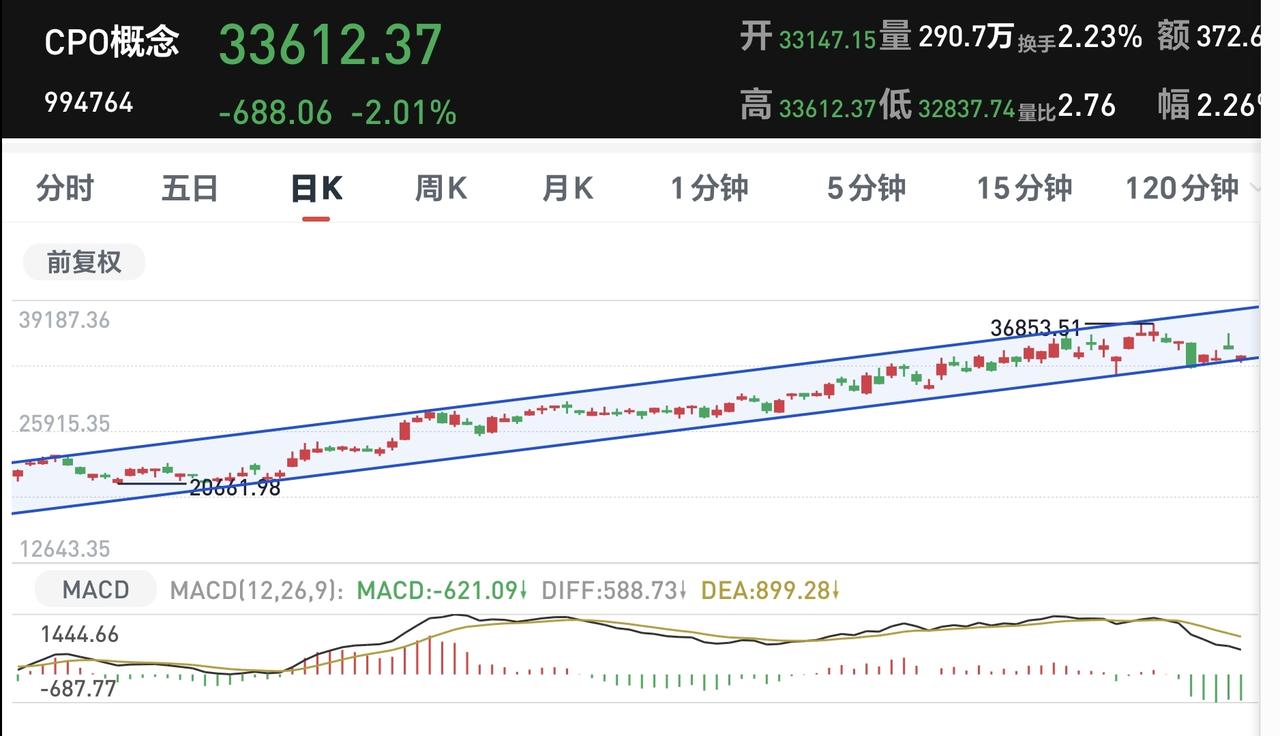 基金:只要出现了恐慌盘的涌出,我们就要做好进场的准备 今天市场低开,三大指数都是低开,创业板指开盘下跌了1.54%,开于3300点,上证指数开盘下跌了1.32%,开于3904点。 开盘以后小幅度震荡,黄色线在蓝色线下方,两条线之间的敞口并不是很大,继续观察两条线的位置会不会有变化。 两市累计成交7285亿,相比于昨天同期放量了23%,市场上涨479家,下跌4990家,上涨家数大幅度少于下跌家数,涨停24家,跌停17家,主力资金净流出315亿,从主力资金净流出的幅度以及跌停家数看,恐慌盘的涌出并没有到极致,如果见到百股跌停,才是恐慌盘涌出的极致,现在的跌停家数只有15家,数量还是非常少。 整个市场上涨幅度最大的三个板块是:煤炭板块,锂矿板块,光伏板块,下跌幅度最大的三个板块是:黄金板块,通信板块,cpo板块。 整个市场主力资金净流入最多的三个板块是:煤炭板块,体育板块,油气开采板块,主力资金净流出最多的三个板块是:高端制造板块,电子板块,国企板块。 持有基金现在盘中估值亏损了12934元,盈利的板块只有新能源汽车板块,亏损金额最大的三个板块是:创新药板块,证券板块,白酒板块。 今天是有恐慌盘涌出的第一天,如果恐慌盘涌出到了极致,有可能恐慌盘的涌出就只有一天,如果恐慌般的涌出并不是很到位,后面也许还会有恐慌盘涌出,到现在为止,恐慌般的涌出还没有到极致。 Cpo板块现在盘中估值下跌了3.32%,持有人数在所有板块当中排名第二位。 Cpo板块日线级别处于上涨通道中,今天的大跌并没有跌破这个上涨通道的下轨线,但也距离这条下轨线很近,近期观察会不会有效破位这条下轨线,如果有效破位日线级别上涨通道的下轨线,短线持有的人需要注意风险。 CPO板块周线级别处于上涨通道中,今天的下跌并没有改变这个板块周线级别的上涨趋势,现在的位置距离上涨通道的下轨线还有一段空间,长线持有的人可以继续持有,周线级别上涨通道下轨线是长线持有者的只有条件,只要不跌破这个上涨通道的下轨线,长线持有的人都可以继续持有。 市场今天是有恐慌盘涌出,虽然恐慌盘的涌出没有到极致,但只要出现了恐慌盘的涌出,就距离底部不远,只要出现了恐慌盘的涌出,我们就要做好进场的准备,有观点以后我会第一时间分享给大家。 大家把自己的仓位写在评论区,我要看一下大家的持仓情况。