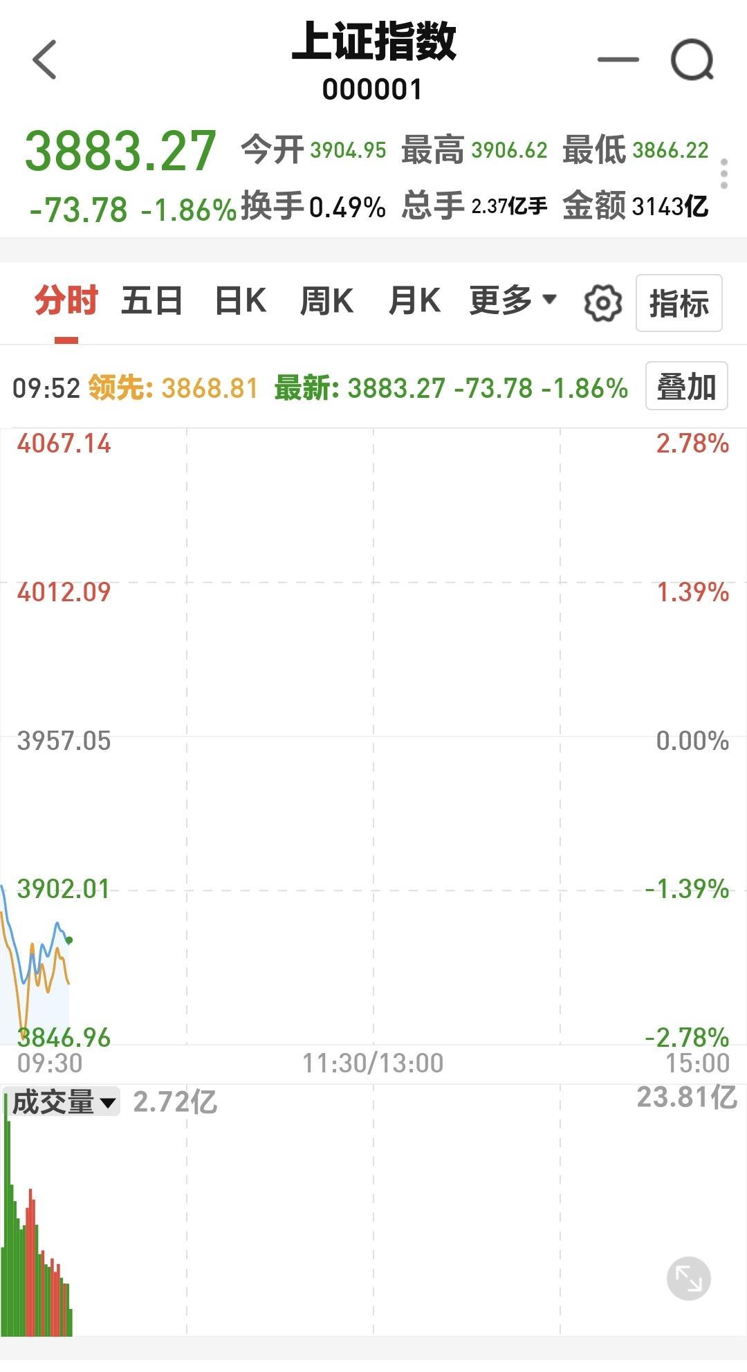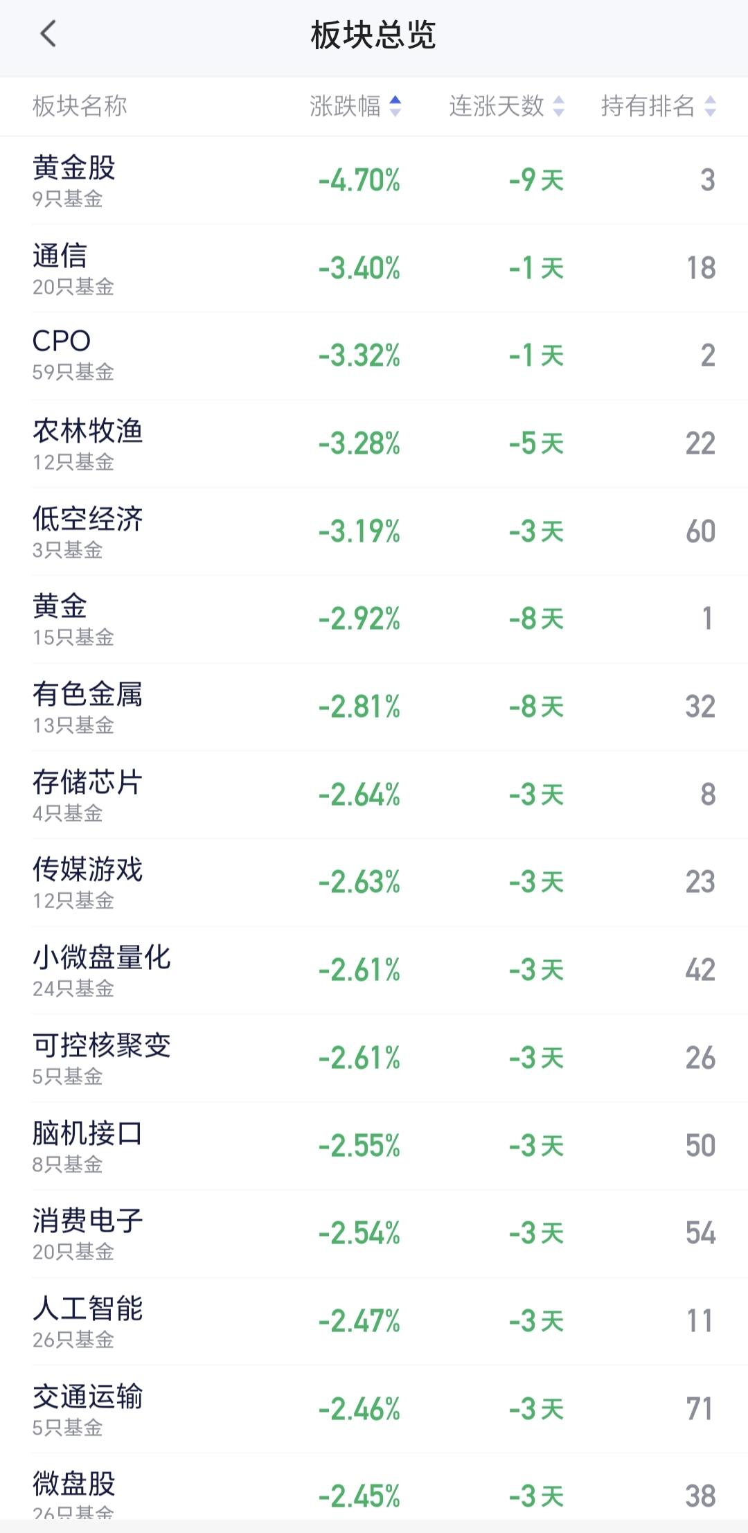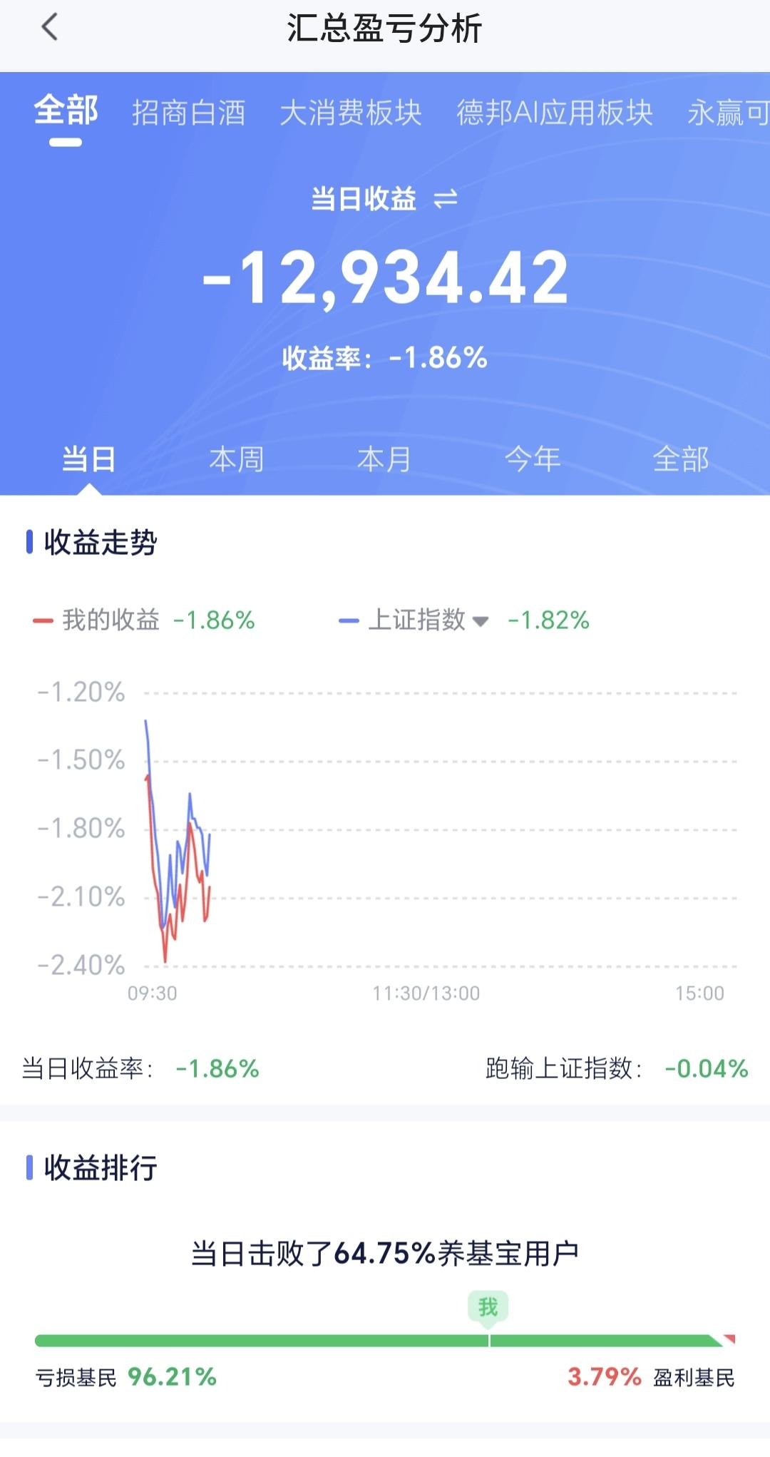 基金:只要出现了恐慌盘的涌出,我们就要做好进场的准备 今天市场低开,三大指数都是低开,创业板指开盘下跌了1.54%,开于3300点,上证指数开盘下跌了1.32%,开于3904点。 开盘以后小幅度震荡,黄色线在蓝色线下方,两条线之间的敞口并不是很大,继续观察两条线的位置会不会有变化。 两市累计成交7285亿,相比于昨天同期放量了23%,市场上涨479家,下跌4990家,上涨家数大幅度少于下跌家数,涨停24家,跌停17家,主力资金净流出315亿,从主力资金净流出的幅度以及跌停家数看,恐慌盘的涌出并没有到极致,如果见到百股跌停,才是恐慌盘涌出的极致,现在的跌停家数只有15家,数量还是非常少。 整个市场上涨幅度最大的三个板块是:煤炭板块,锂矿板块,光伏板块,下跌幅度最大的三个板块是:黄金板块,通信板块,cpo板块。 整个市场主力资金净流入最多的三个板块是:煤炭板块,体育板块,油气开采板块,主力资金净流出最多的三个板块是:高端制造板块,电子板块,国企板块。 持有基金现在盘中估值亏损了12934元,盈利的板块只有新能源汽车板块,亏损金额最大的三个板块是:创新药板块,证券板块,白酒板块。 今天是有恐慌盘涌出的第一天,如果恐慌盘涌出到了极致,有可能恐慌盘的涌出就只有一天,如果恐慌般的涌出并不是很到位,后面也许还会有恐慌盘涌出,到现在为止,恐慌般的涌出还没有到极致。 Cpo板块现在盘中估值下跌了3.32%,持有人数在所有板块当中排名第二位。 Cpo板块日线级别处于上涨通道中,今天的大跌并没有跌破这个上涨通道的下轨线,但也距离这条下轨线很近,近期观察会不会有效破位这条下轨线,如果有效破位日线级别上涨通道的下轨线,短线持有的人需要注意风险。 CPO板块周线级别处于上涨通道中,今天的下跌并没有改变这个板块周线级别的上涨趋势,现在的位置距离上涨通道的下轨线还有一段空间,长线持有的人可以继续持有,周线级别上涨通道下轨线是长线持有者的只有条件,只要不跌破这个上涨通道的下轨线,长线持有的人都可以继续持有。 市场今天是有恐慌盘涌出,虽然恐慌盘的涌出没有到极致,但只要出现了恐慌盘的涌出,就距离底部不远,只要出现了恐慌盘的涌出,我们就要做好进场的准备,有观点以后我会第一时间分享给大家。 大家把自己的仓位写在评论区,我要看一下大家的持仓情况。