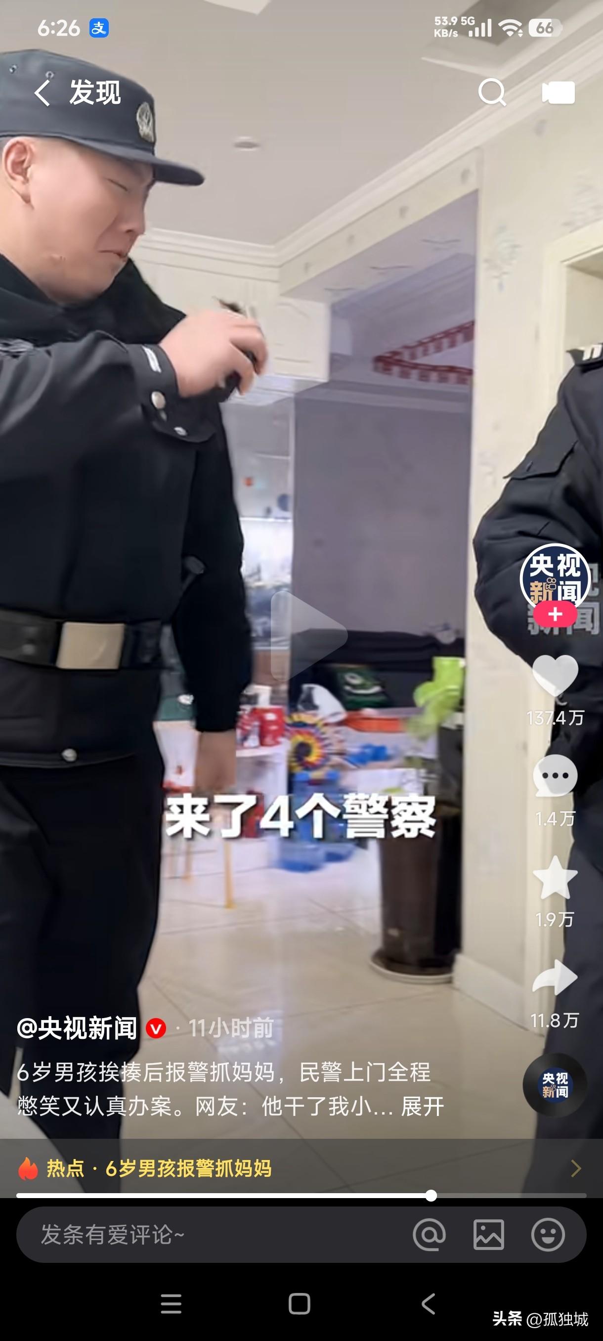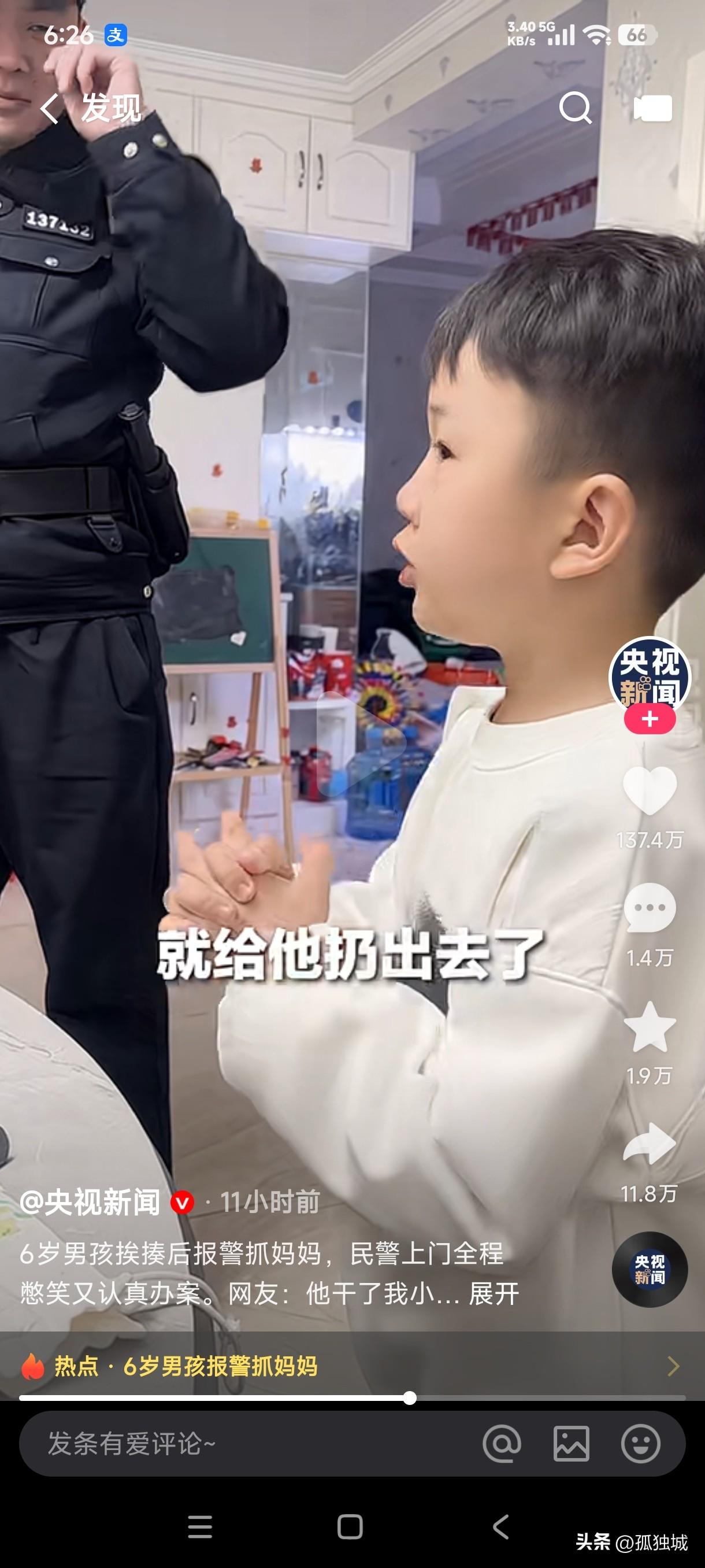 6岁男孩挨揍后报警抓妈妈,4个警察迅速上门憋笑认真办案,如今这孩子受委屈了还知道拿起法律的武器保护自己,这算不算大义灭亲? 不挨打的童年是不完整的,这孩子被妈妈给揍了一顿,然后又给扔出了门外,他居然用奶奶偷偷手机报警,说妈妈打小孩,妈妈也是既好笑又惊讶,谁能想到不一会的功夫警察居然找上了门,这把上门办案的警察也看的一愣一愣的,全程憋笑认真办案,他们心想这遇到的案子不计其数,这小屁孩报警抓妈妈的操作还真是少见,这案子到底该如何办,是当场给孩子和妈妈调解?还是应该把这孩子妈妈抓走? 网友们看到这一幕也是惊讶至极,我们小时候就是被父母揍的不成人样也从来没有想到报警,这孩子居然被妈妈揍了后报警抓妈妈,警察走后会不会揍的更狠了,这孩子算不算大义灭亲了?