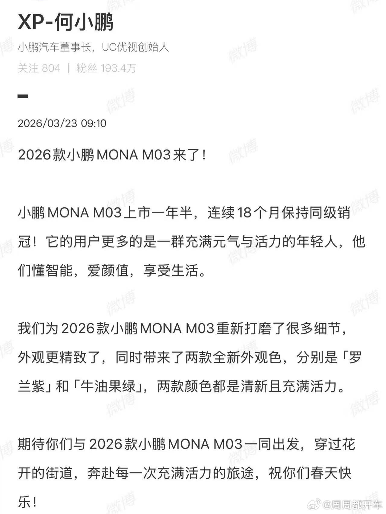 2026款的小鹏MONA要上市咯!依旧是欧阳娜娜代言,这次发布会说不定又可以看见欧阳娜娜了。而且这次Mona M03上市之后,年中应该还有一个Mona的SUV。Mona这个系列主打一个年轻人的第一台车,性价比贼高,值得期待。何小鹏官宣新款小鹏MONA下月发布2026款小鹏MONA祝你春天快乐
