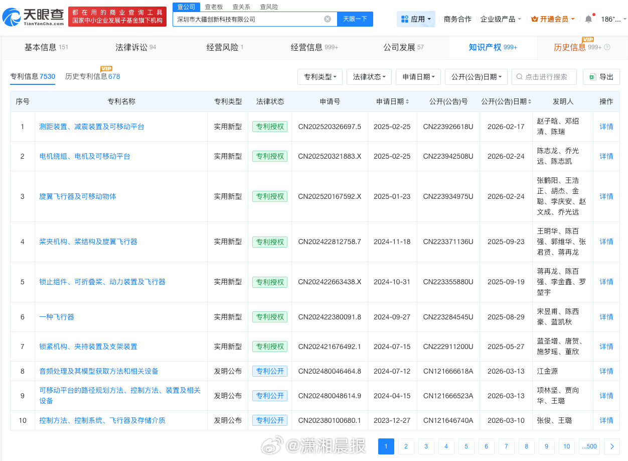 知识产权信息显示,该公司已申请7000余项专利,包括“旋翼飞行器及可移动物体”“桨夹机构、桨结构及旋翼飞行器”等,其中部分专利已获授权。