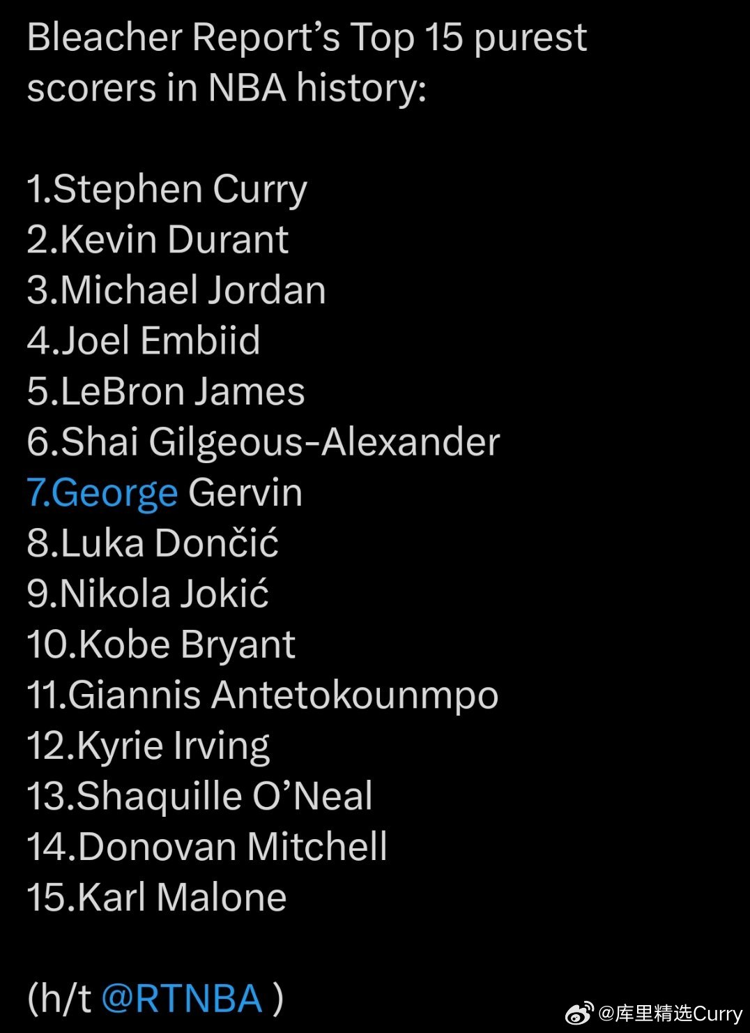 Bleacher Report评选NBA历史最纯粹得分手前15名,库里排名第一: