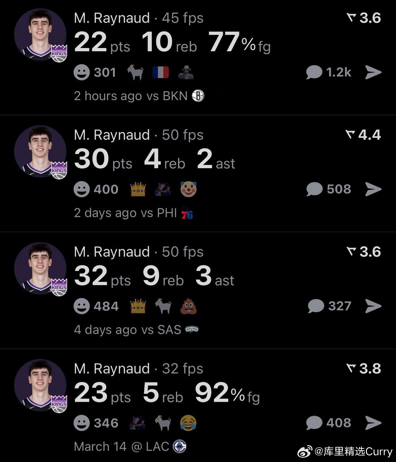 国王新秀雷诺,过去三场场均28分7.7板,命中率61.8%,三分55.6%,罚球84.6%😳