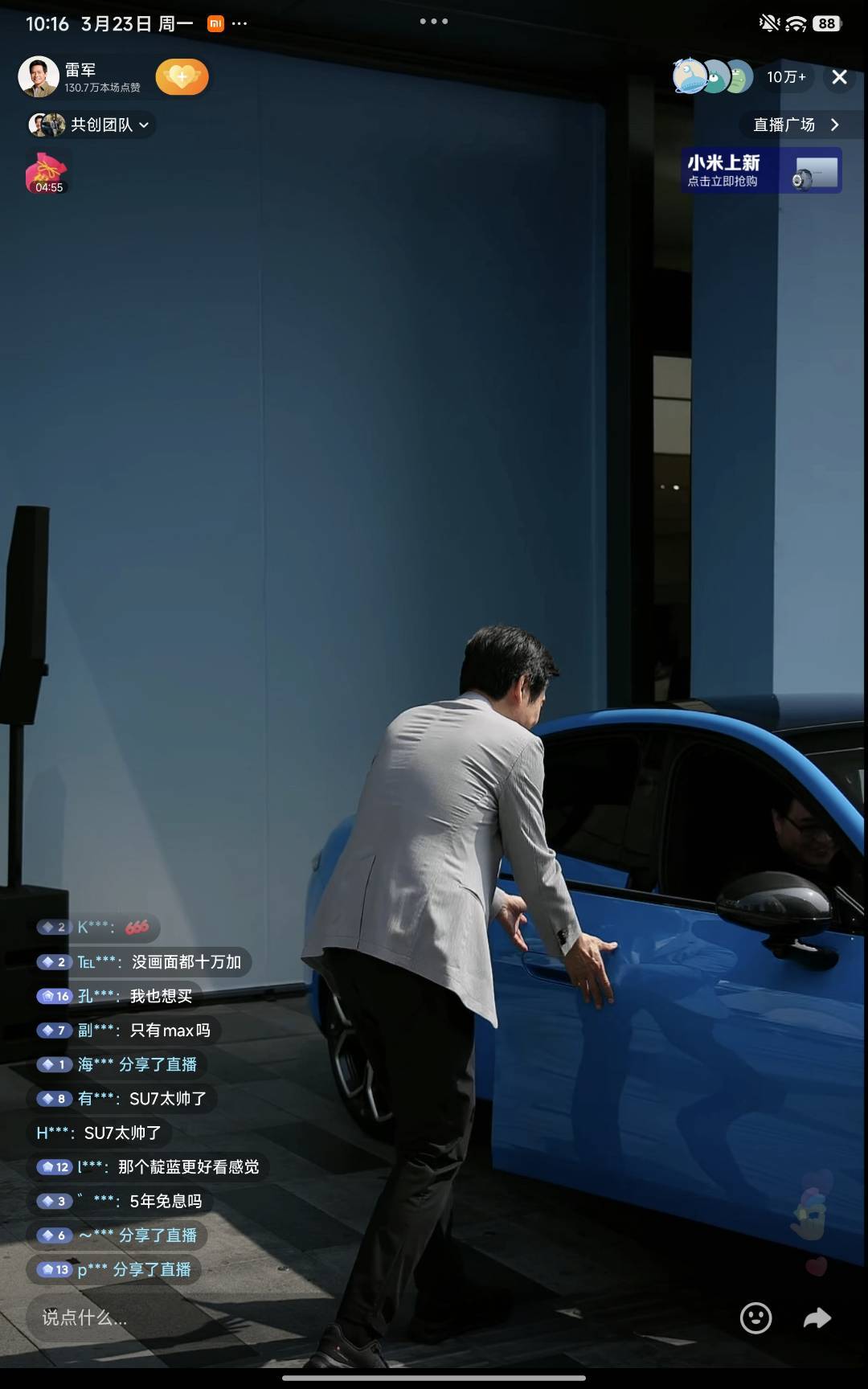 小米新SU7今日开启交付 今天小米新SU7正式开启交付!大家期待已久的“总裁开车门”环节自然少不了的,而且今天除了雷总之外,苏炳添苏神也来到了现场给车主们开车门,这下是“亚洲超人开车门”了!甚至苏神还给车主们准备了提车果篮,祝车主们一帆风顺、心想事成~