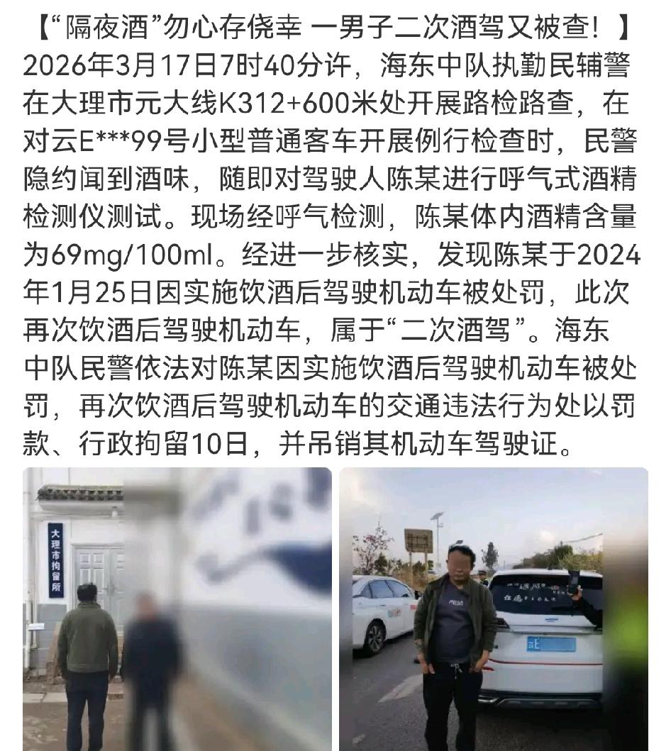 🍻🍺🍶【“隔夜酒”勿心存侥幸 一男子二次酒驾又被查!“隔夜酒”真的不能心存侥幸啊! 2026年3月17日7时40分,大理市海东中队查到陈某酒驾,呼气检测其体内酒精含量69mg/100ml。而他2024年1月就因酒驾被处罚过。 判断酒驾看的是驾驶时血液酒精含量,不是饮酒时间间隔。像多地有司机饮酒次日被查,数值33mg/100ml到155mg/100ml都有。 3月13日,白沙的王某也是“隔夜酒”被查,他曾无证酒驾被罚款,这次又因“隔夜酒”被拘5日、吊销驾照、罚款1800元,两年内不得重考。酒精代谢因人而异,喝多了最好隔24小时再开车,别拿自己和他人安全开玩笑!