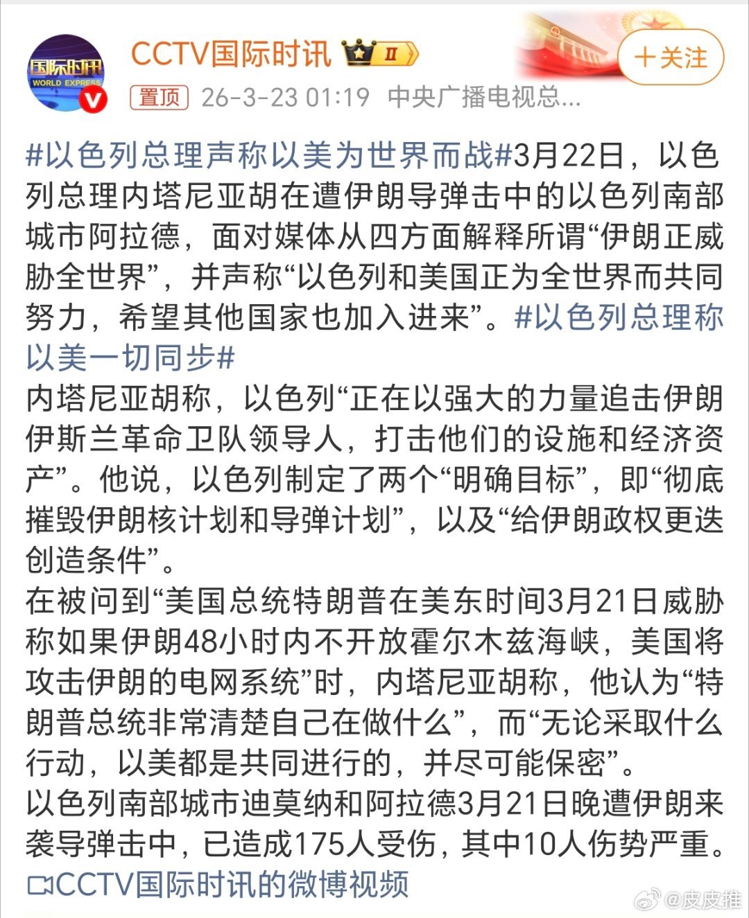 以色列总理声称以美为世界而战内塔尼亚胡的这句“以美为世界而战”,这是他们为伊朗战争“合法性”找借口,也是在道德绑架世界各国,尤其是欧洲“小弟们”,搞得他们好像是为了世界匡扶正义。。。