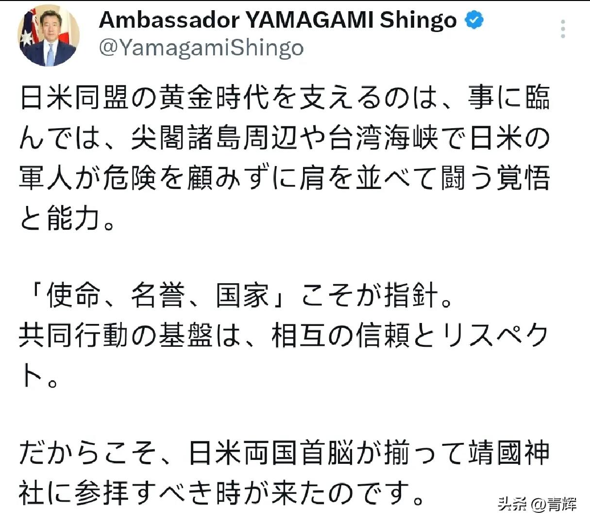 高市早苗访美归来,日本大使兴奋异常:日美应共同参拜靖国神社 高市早苗已经结束了对美国的访问,近期我们注意到有一个日本的外交大使对此事表现得兴奋异常。日本驻澳大利亚大使山上信吾近期通过社交平台发表了自己的观点,此人声称,日本和美国是长期以来并肩作战的盟友,在所谓的尖阁列岛和台湾海峡都并肩行动,这展现了两国之间相互信任的基础。所以这个时候,特朗普应该和首相高市早苗一起共同参拜日本靖国神社。 作为日本的高级别的外交人员,山上的这番言论已经证明了此人是彻头彻尾的右翼势力,他的这种观点,也充满了挑衅和别有用心。他口中所谓的尖阁列岛是中国固有的领土,台湾海峡是中国自己的内政!这种言论已经对我国形成了挑衅,属于典型的有意为之,而且还是非常刻意的把日本和美国绑定在一起。 另外让特朗普和高市早苗一起去参拜靖国神社,这种几率比中彩票还要难,高市早苗即便去1万次阿灵顿,特朗普也不可能去一次靖国神社。更不要说现在特朗普正心心念念的想要访问中国了! 而至于这个人高度赞扬的所谓高市早苗访美这件事情,以现在的实际情况来看,充其量只是让高市早苗在自己的个人政治生涯中获得了一定的成功,但整体上来说,已经严重影响了日本的核心利益。拿出了几百亿美金的投资换来的只是美国对日本关税从25%降到15%。高市早苗本人在美国对特朗普点头哈腰、媚态尽出,却被特朗普公开提到珍珠港进行敲打。而且此次访问从头到尾,美国都没有和日本搞联合声明,没有在对我国的政策以及霍尔木兹海峡护航等关键问题上达成一致。所以高市早苗的这种访问不仅没有彰显日本和美国所谓的盟友关系,反而让更多的日本人看清了在日美关系中,日本属于从属的位置。