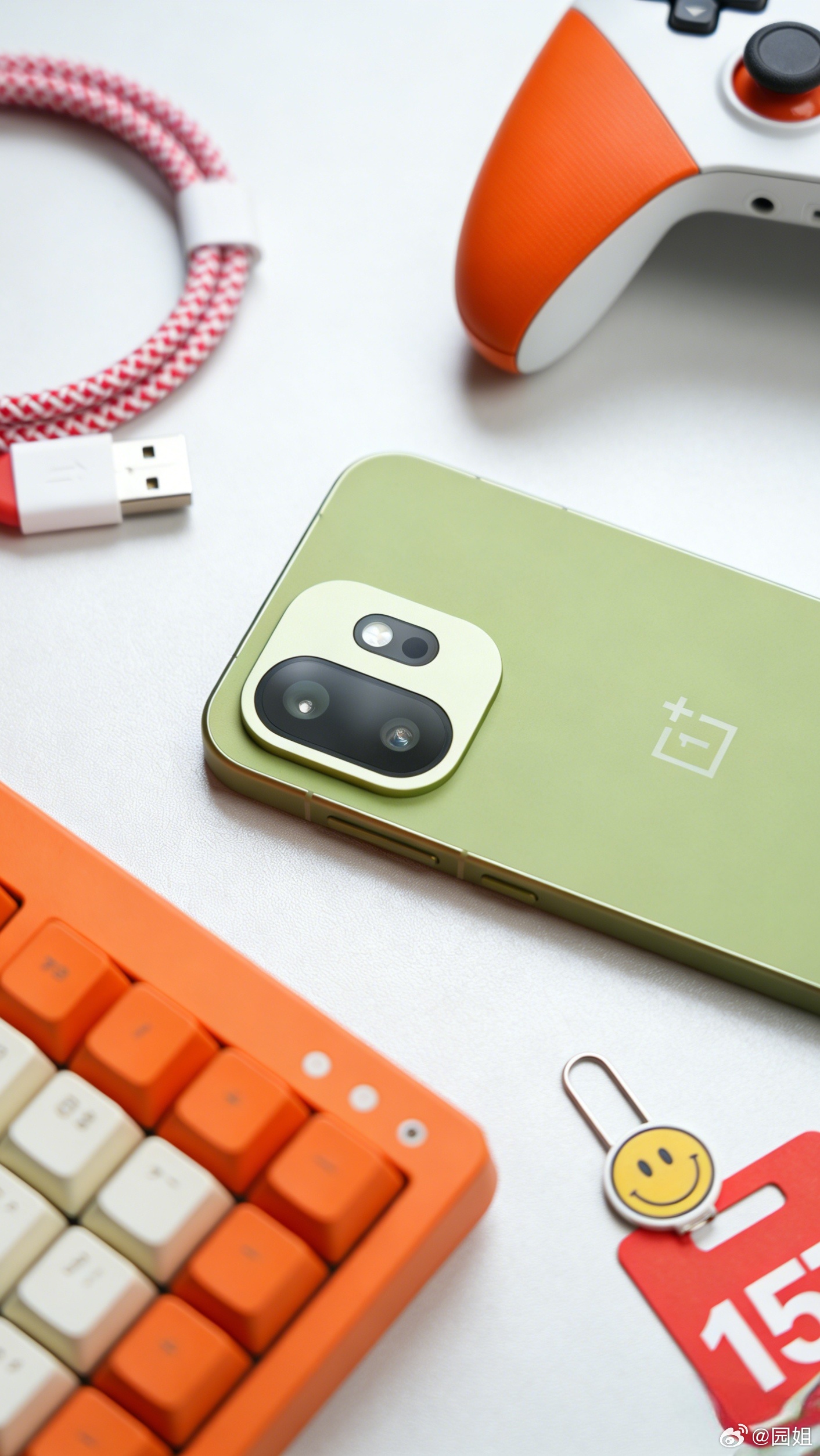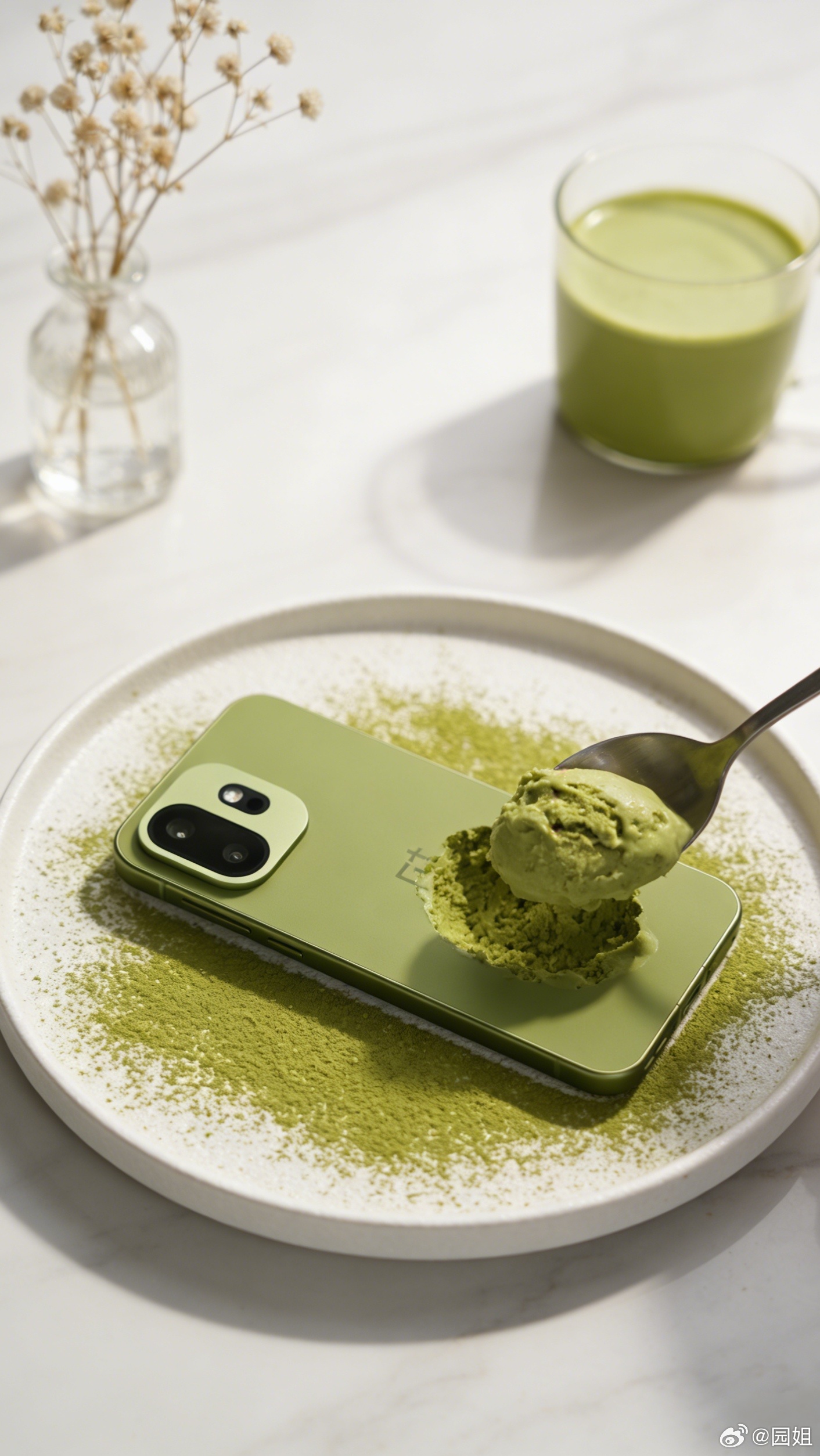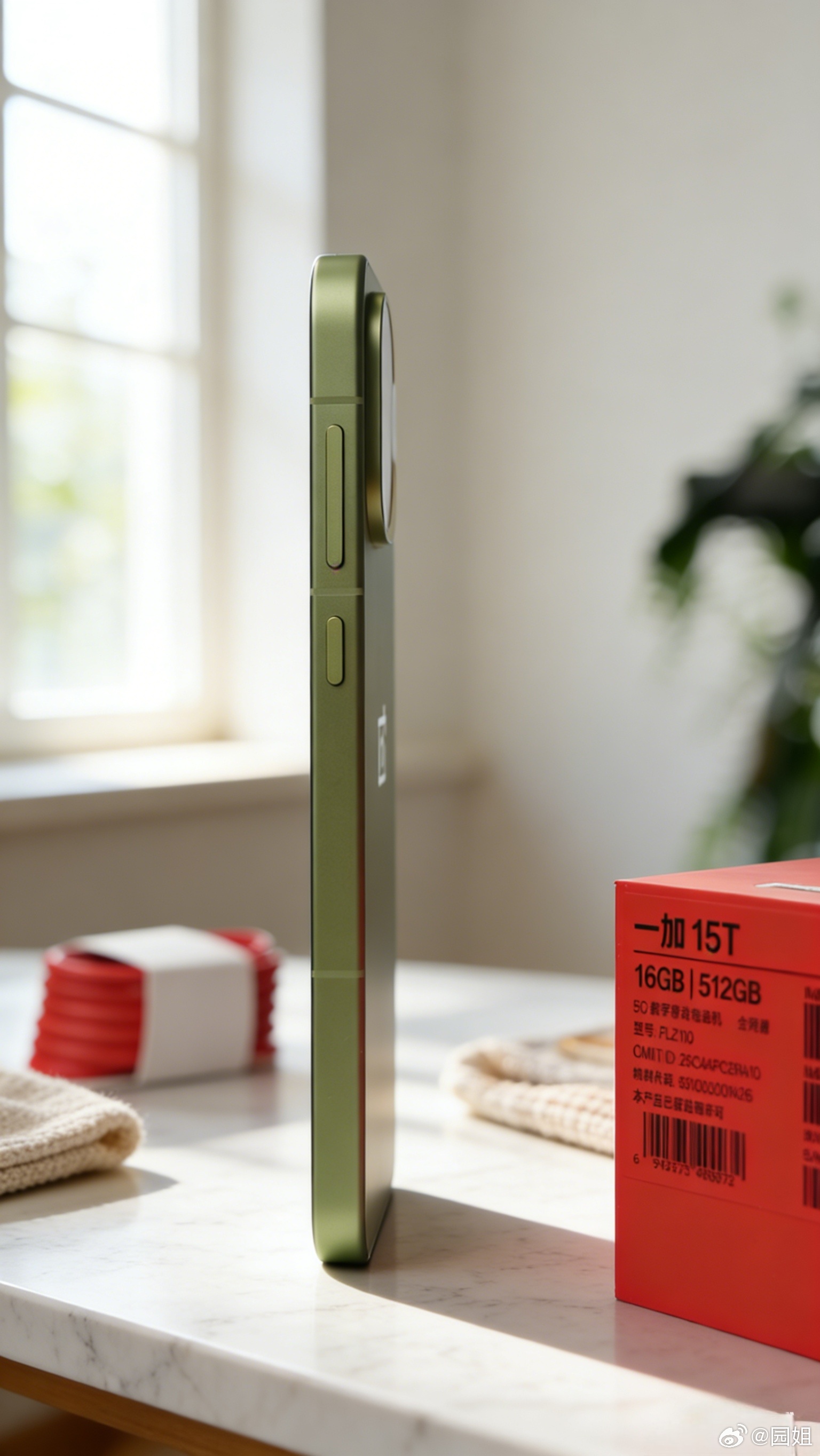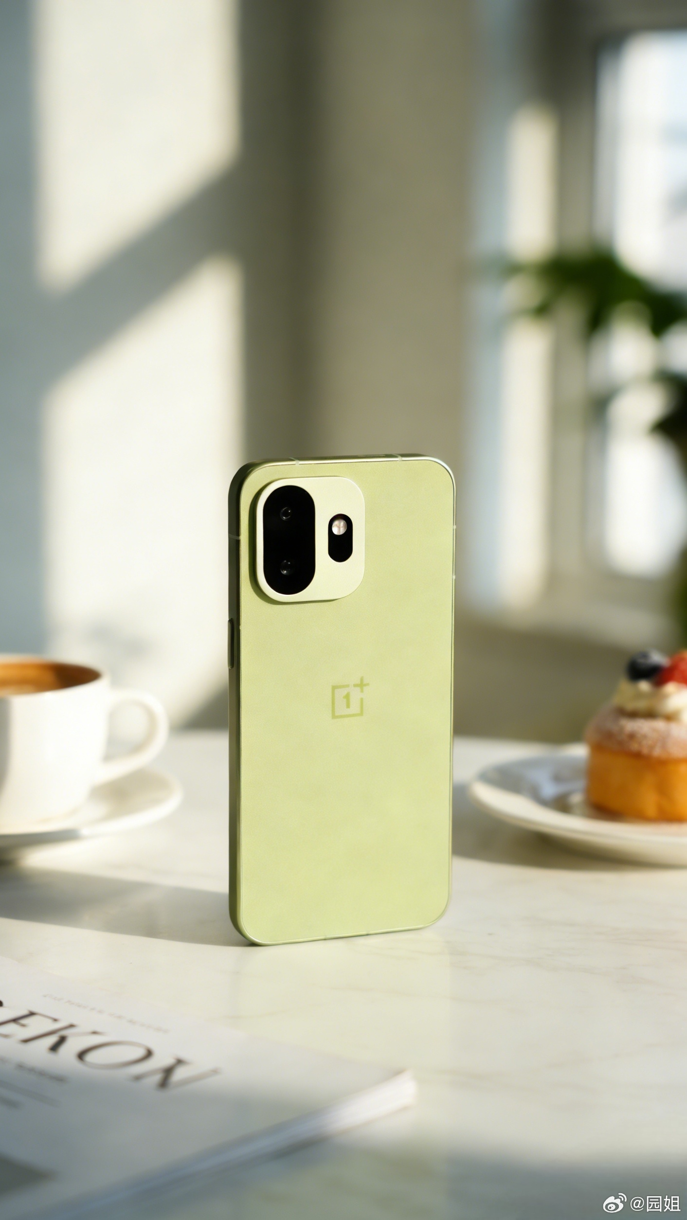 松弛抹茶,这个名字果然够松弛。作为为数不多的小屏旗舰,一加15T这个外观设计确实讨喜。雾面哑光的手感细腻又温润,握在手里一点也没有压力。镜头模组的设计干净利落,没有多余的花哨设计,低调又耐看。往洒满阳光的桌面一放,随便和咖啡、书本搭一下,氛围感直接拉满,光是看着都觉得心情变好了。