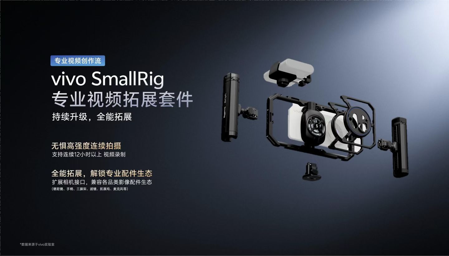 视频支持全链路全焦段 4K 120fps 10bit Log,Film Style、Film Look,全焦段OIS光学防抖。全新相机交互,风光 Pro 交互,影像手柄套装,vivo SmallRig 专业视频拓展套件。