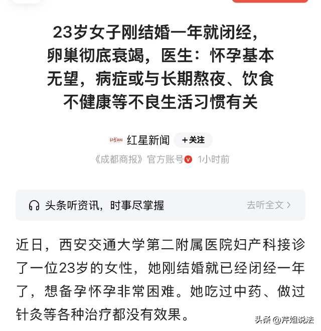 陕西西安,一位23岁的女子结婚一年,想着趁年轻身体好跟老公要个孩子。但是1年了也没有怀孕,月经也不来了。到如今已经停经1年,这可急坏了女子。去医院检查,医生告诉她一个不好的消息:基本的卵泡也没有,几乎闭经,想要怀孕几乎毫无可能。 红星新闻3月23日报道了这则新闻。 对于张女士(化名)来说,她本想着要开启一个幸福的婚姻生活,没想到,老天却跟她开了这么大的玩笑。 1年前,张女士才22岁,跟丈夫结婚后,张女士就想着趁着年轻,跟丈夫要个孩子。 谁知道,努力造人良久,肚子几乎没有动静。 更加让张女士焦躁的是,她的大姨妈几乎是不来了。 一开始,张女士还以为,估计也就是不调和吧,于是就去治疗,喝中成药,还做其他各种调理。 可以说,这一年来,张女士非常辛苦,为了就是能圆满自己的“宝宝梦”。 谁知道,最后肚子还是没有动静,没辙,张女士就去医院做了个全方位的检查。 拿到诊断报告单的时候,医生告诉张女士一个令她震惊的消息:你想要怀孕几乎毫无可能了。 根据医生直白的解释就是,张女士基础卵泡几乎全都丧失了,卵巢也衰竭掉了。才23岁的女子,却已经到了闭经的水准。 而且张女士根本就不是不调和,也不是紊乱,不是说后面慢慢调理就能解决问题了。 医生的意思就是:这是永久性的,不可逆的,身体的水平就这样了。 张女士非常痛苦,询问为什么会这样呢? 医生告知,第一个就是她自身身体就出现了问题,这个可能是先天的,但是以前要是正常,证明身体功能还是可以的。 那么,原因就在于第二个:是否有长期熬夜的情况? 张女士听了,不禁点点头。原来,她后天习惯不好,长期熬夜,饮食也不规律,吃的也是乱七八糟的。所以,如此日积月累的“乱造”自己的身体,最后就把身子给拖垮了。 而这个新闻看着很糟心,要知道“卵巢早衰”,这个怎么也是40岁以后才可能出现的问题啊。 张女士如今才23岁...... 所以说,提前操心一下自己的身体吧,不能等到老天完全给你关闭了大门,那个时候才后悔,根本就不灵的。 医生也提醒了一件事:如果感觉经常莫名的燥热、出汗、关节不舒服,这些类似于更年期才有的情况,其实很有可能身体提前“掏空”,更年期提前到来。 出现这些情况,别拖,赶紧去医院查一查哦! 张女士出了这个情况,非常苦恼,不能生育孩子,或许是比较大的伤痛。这个时候,她的丈夫是否可以提出离婚呢? 对于这个问题,就涉及到法律跟道德方面了。 结婚后,女方因为身体原因不能生育,男方可以提出离婚,但是不能仅仅因为“不能生育”作为理由强制离婚。 法律是否会支持离婚,关键在于夫妻感情是否已经破裂。 根据《民典法》规定,法律保护婚姻自由,包括离婚自由,判断离婚的标准是:夫妻感情是否已经破裂,而不是一方不具备生育能力。 张女士不能生育,是婚后才发现的情况,婚后患病不属于可以撤销婚姻的情形,即使一方婚前没有告知健康状况,也不能因此撤销婚姻,除非《民典法》里规定了不能生育是重大病症,而且婚前没有提前告知。 从法律跟伦理的角度来看,婚后生育并不是婚姻的唯一目的。 婚姻关系的维系,应该是基于感情、责任以及相互扶持。不能生育,这是女方无法控制的健康问题,但是男方如果产生“嫌弃”的心态,或者单方面归咎女方的责任,由此来看,又缺乏同情心,也违背了婚姻的初心。 出现这样的情况,虽然法律不禁止以此为由去上诉离婚,但是更加倡导夫妻共同度过难关,必要时可以领养、或者辅助生育。 发生问题了,共同面对,而不是说,产生嫌弃、甚至想要抛弃的念头。 如果后面确实引发矛盾,夫妻之间不能继续共同生活,二人办理了离婚,在判定财产分割方面,会给女方多一些的经济帮助,主要考虑到女方的困难情况,判决男方也需要适当多给些帮助。 还是回归到健康话题,不要因为年轻,就“霍霍”自己的身体哦,年轻并不是挡箭牌,还是需要好好爱自己、谨慎应对健康问题。 对此,大家都怎么看呢?