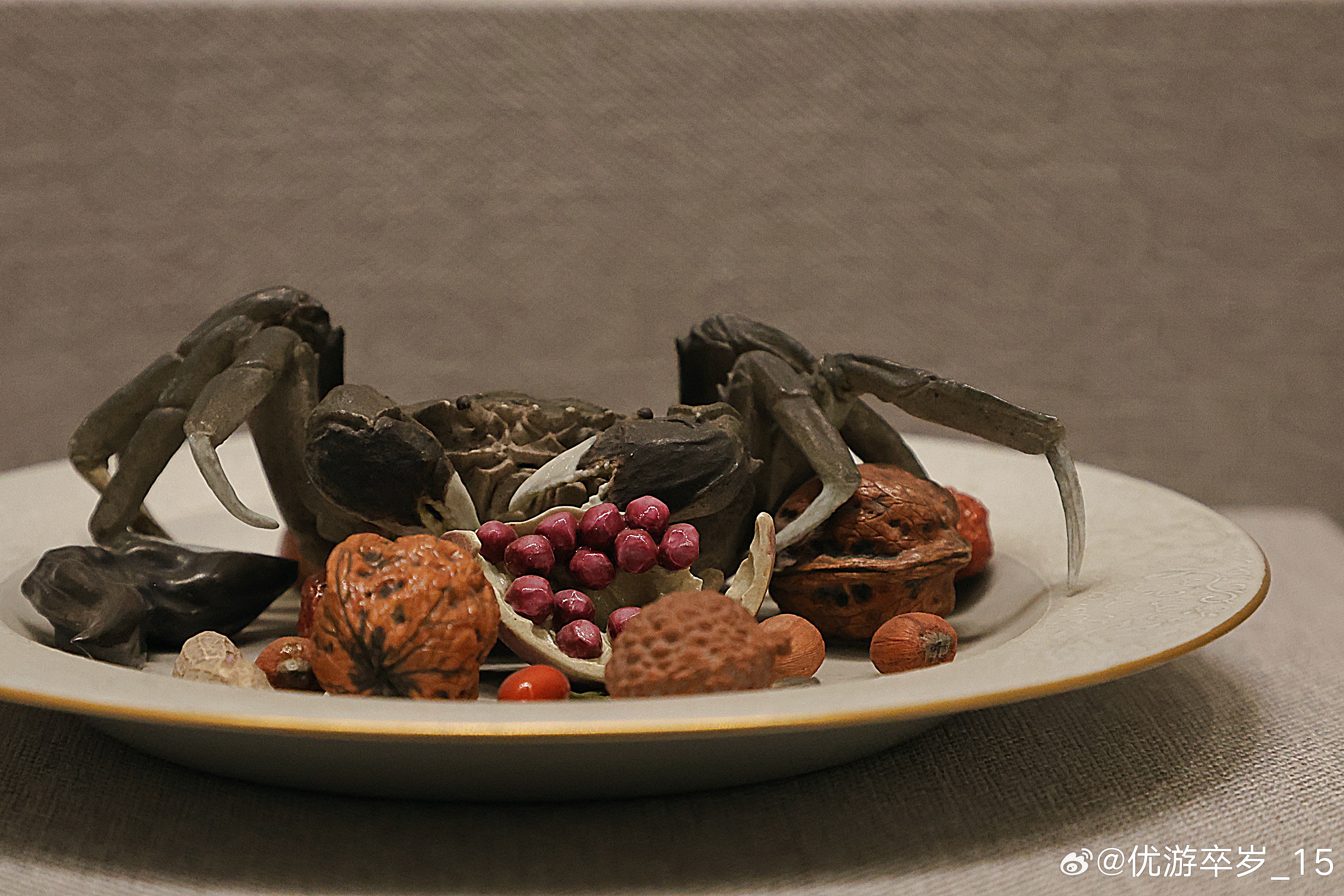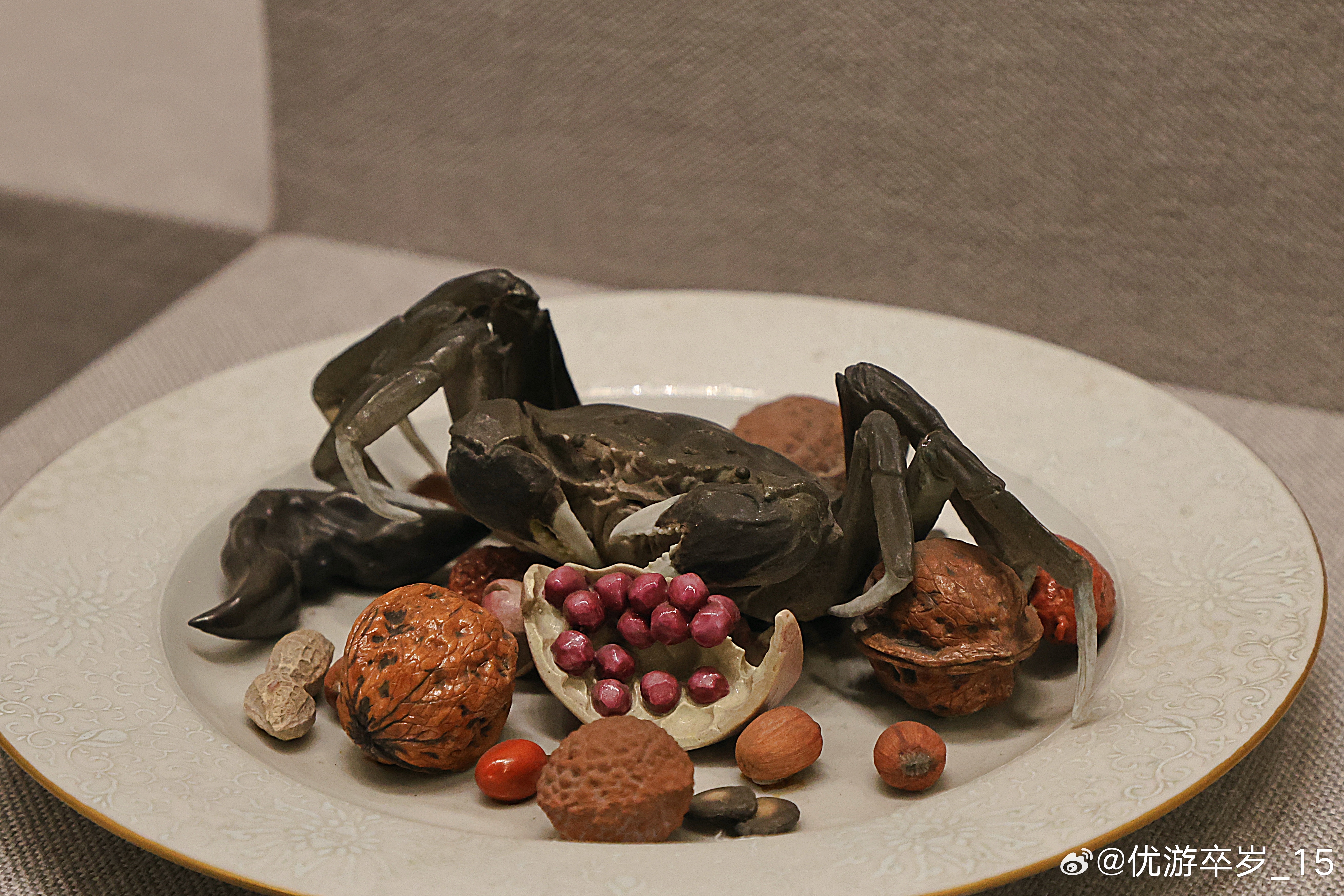 我的2026 景德镇窑粉彩塑雕像生果品蟹盘清乾隆(公元1736-1795年)故宫博物院藏盘内盛有像生果品和螃蟹。像生物品强调的是追求与原物大小、形状、质感等几无二致的视觉感受,此件像生果品盘中的诸物酷似原物。更值得一提的是,盘中各物或其组合多具有吉祥含义,如螃蟹寓意科举考试殿试考中“一甲”(状元、榜眼、探花),石榴寓意多子;而枣、花生、瓜子组合在一起则寓意“早生贵子”。约会博物馆 文物