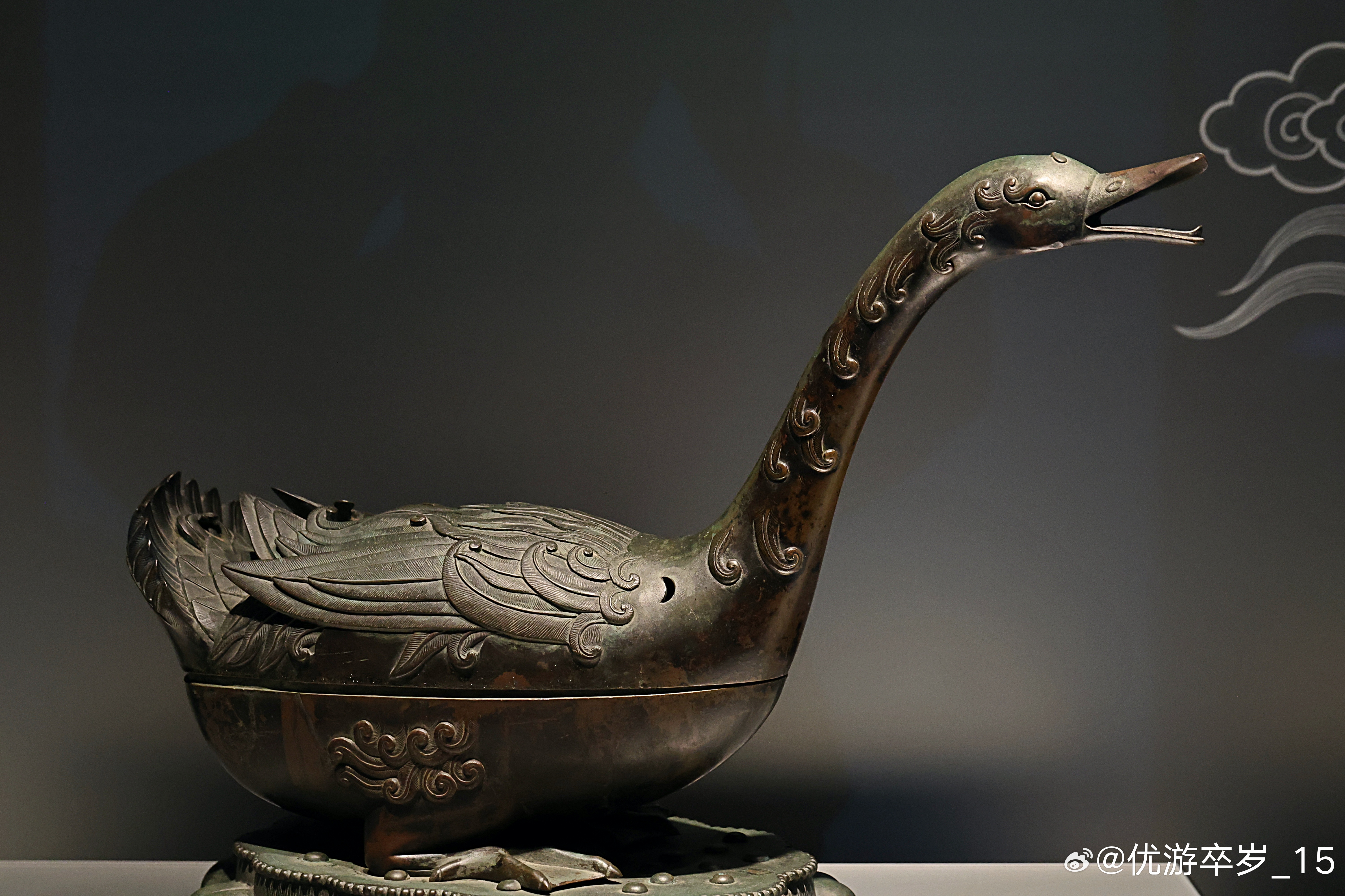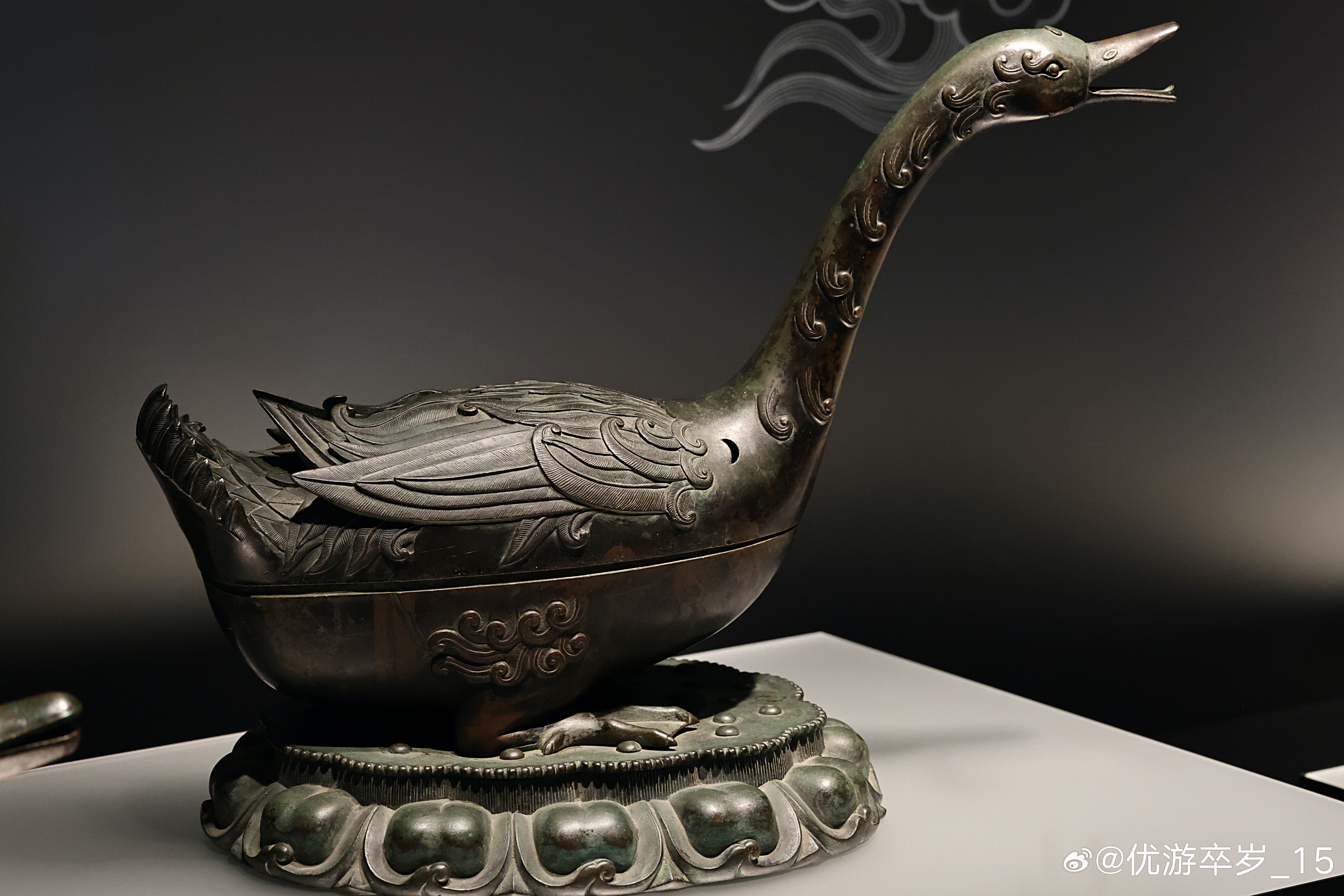 我的2026 【融古烁新-宋元明清铜器的复古与创新】雁形铜熏炉·明大都会艺术博物馆藏雁形香炉是自宋代起最受欢迎的仿古器型之一。汉代雁形香炉原型的特点是带透雕顶盖,宋之后最大的区别在于鸟背几乎为实心,因此烟气需从张开的鸟喙中散出。上海博物馆 2026.2.26约会博物馆文物