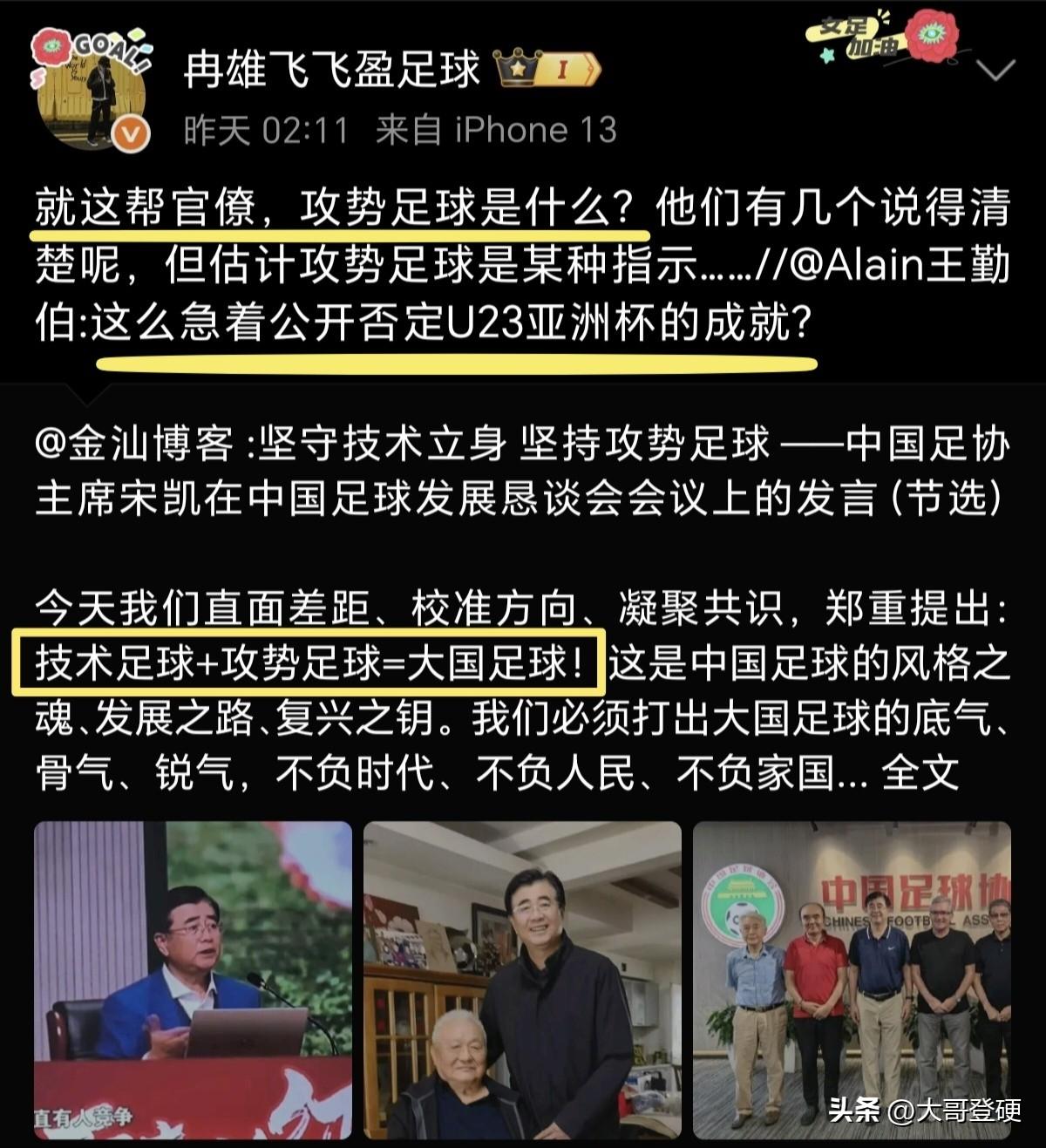 足协主席宋凯提出“大国足球”的构想,这两个足球媒体人,跟被踩了狗尾巴似的跳出来,对宋凯的构想一顿贬损[发怒] 近日,足球评论员金汕发表了一篇关于足协主席宋凯的发言节选的个人社媒,其中讲到关于中国足球未来要踢什么足球的和中国足球未来发展的方向,技术足球+攻势足球=大国足球[奋斗] 客观而言,足协主席宋凯的这个构想没有任何问题,也是切中了中国足球目前发展的痛点,但万万没想到!两个足球媒体人跳了出来,对宋凯的构想一顿贬损,一个叫王勤伯,一个叫冉雄飞[震惊] 王勤伯把足协主席宋凯的大国足球比做一场春梦[左哼哼] 冉雄飞把足协领导比做官僚不懂攻势足球为何物[右哼哼] 好巧不巧!这两还都出自《体坛周报》,一个是现在《体坛周报》的记者,另一个是前《体坛周报》记者[吃瓜群众] 更巧合的是!这两个都是趴在国外不回国的,一个趴在意大利,一个趴在美国,据说都是因为相同的原因,才不敢回国的[吃瓜群众] 既然王勤伯和冉雄飞二位大师这么有才,就请抓紧时间回国,当面给中国足协领导上一课,别留在国外,也别趴在互联网上,这样太屈才了[融化]