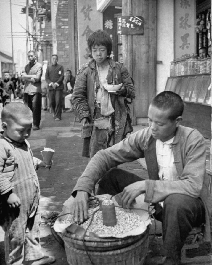 抗战时期,中国城镇街头,卖黄豆的小贩坐在竹筐前,用竹筒当量具,小心翼翼地称量黄豆——在饥荒年代,黄豆是比大米更“耐饿”的救命粮,也是少数能在街头流通的粮食。他穿着相对整洁的短褂,是乱世里还能靠卖粮维持生计的小商贩,手里的每一粒黄豆,都是沉甸甸的生存资本。 小孩拿着纸包,可能刚买了一小撮黄豆,穿着带条纹的旧棉衣,代表着还能勉强买到一点粮食的阶层。后面那个饥民女孩是这张照片最刺痛人心的核心——头发凌乱、衣衫褴褛到几乎遮体,手里端着一只空碗,眼神死死盯着小贩的黄豆筐。她没有钱、没有粮,只能在街头眼巴巴看着别人交易粮食。