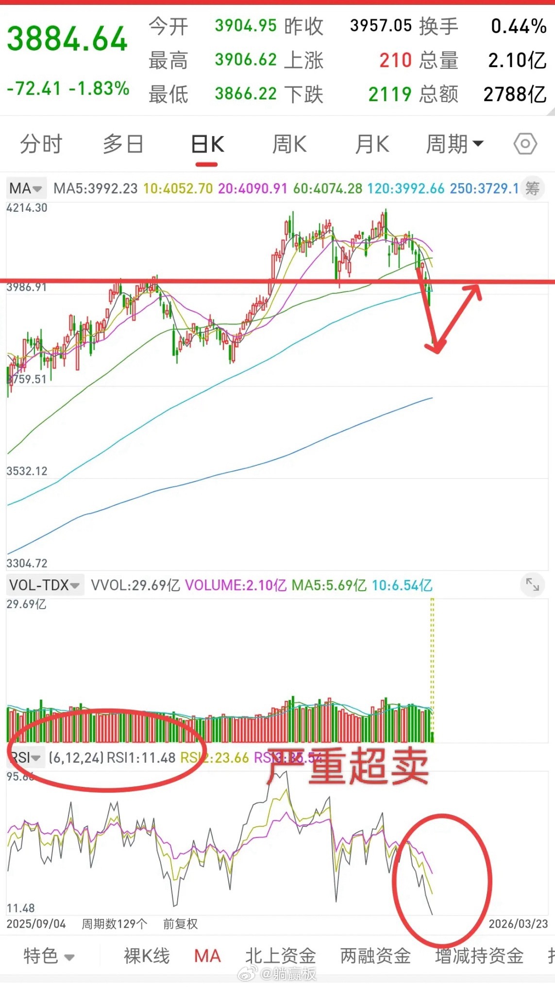 日K线Rsi指标11,严重超卖,截至目前放量1300亿,这里没有理由一味看空。