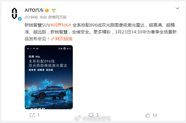 在即将发布的时间,问界M6 终于公布了全系搭载896线双光路图像级激光雷达,超高清、超精准、超远距,新锐智慧,全维安全