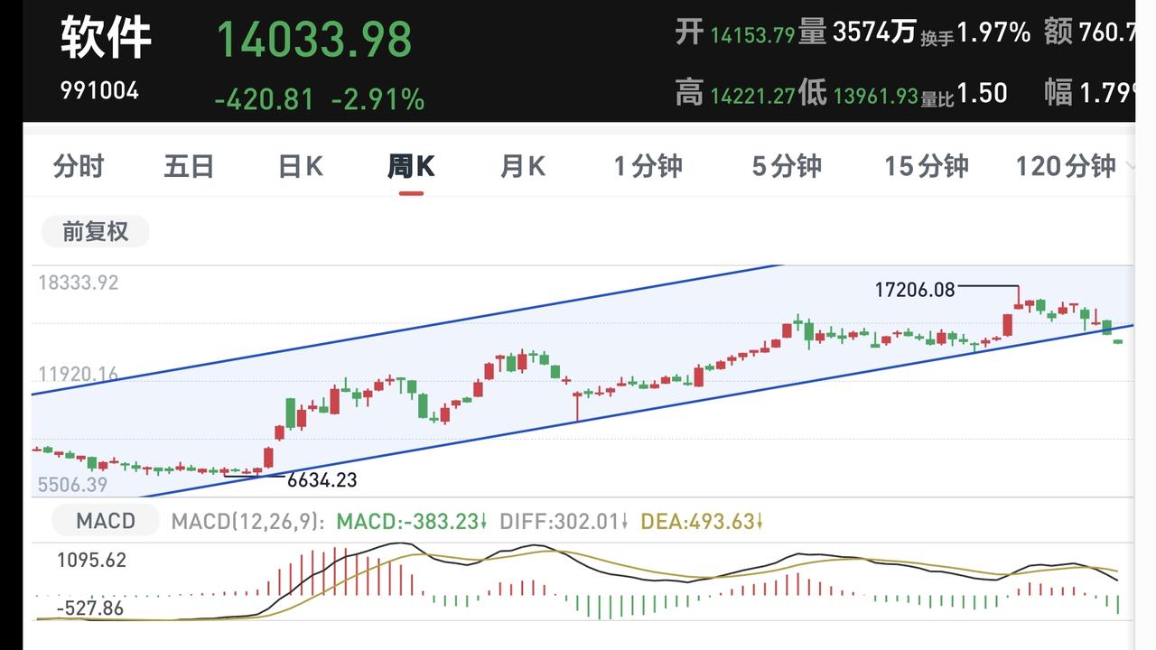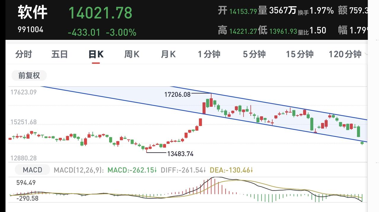 基金:进场抄底的两种方式 市场低开以后小幅度冲高回落,创业板指下跌了1.41%,盘中点位3304点,上证指数下跌了2.07%,盘中点位3875点。 现在黄色线在蓝色线下方,两条线之间的敞口不大,开盘以后有部分恐慌盘涌出,形成了低开低走,在后面的反弹过程当中,没有资金进场,所以就会冲高回落,继续观察盘面的走势,主要观察黄色线和蓝色线的位置会不会有变化,还有就是成交量能不能有效放大,再杀出一波恐慌盘,第二次杀出恐慌盘以后的反弹过程当中有没有资金进场。 两市累计成交12367亿,相比于昨天同期放量了7%,市场上涨605家,下跌4862家,上涨家数少于下跌家数,涨停39家,跌停19家,主力资金净流出440亿。 整个市场上涨幅度最大的三个板块是:煤炭板块,锂矿板块,光伏板块,下跌幅度最大的三个板块是:黄金板块,农林牧渔板块,交通板块。 持有基金现在盘中估值亏损了16958元,盈利的只有新能源汽车板块,亏损金额最大的三个板块是:证券板块,创新药板块,大消费板块。 许多空仓和轻仓的人在等待抄底,但很多人不知道怎么抄底,抄底有两种方式,一种是左侧抄底,一种是右侧上车,左侧抄底是在下跌的过程中分批进场,好处是不会错过这一次的底部区域,坏处是不知道抄底以后还有没有继续下跌,右侧上车是在下跌全部结束以后,确定上涨趋势来了以后进场,好处是进场以后的确定性增强,坏处是不能在最低点附近进场。 有人喜欢左侧抄底,有人喜欢右侧上车,两种方法没有优劣区别,只是个人的喜好而已,如果是你,你是喜欢左侧抄底,还是喜欢右侧上车?你这一次是准备左侧抄底,还是准备右侧上车? AI应用板块现在盘中估值下跌了2.70%,是连续第三个交易日下跌,持有人数在所有板块当中排名第九位。 AI应用(软件)板块日线级别处于下跌通道中,今天的下跌跌破了这个下跌通道的下轨线,注意观察会不会进入加速下跌状态。 AI应用板块上周下跌跌破了周线级别上涨通道的下轨线,本周四继续下跌,观察三周之内能不能重新收回到这个上涨通道内,如果有效破位周线级别上涨通道的下轨线,长线持有的人需要注意风险。 花1秒钟点赞,花30秒钟评论,就是对我最大的支持,谢谢大家的支持。