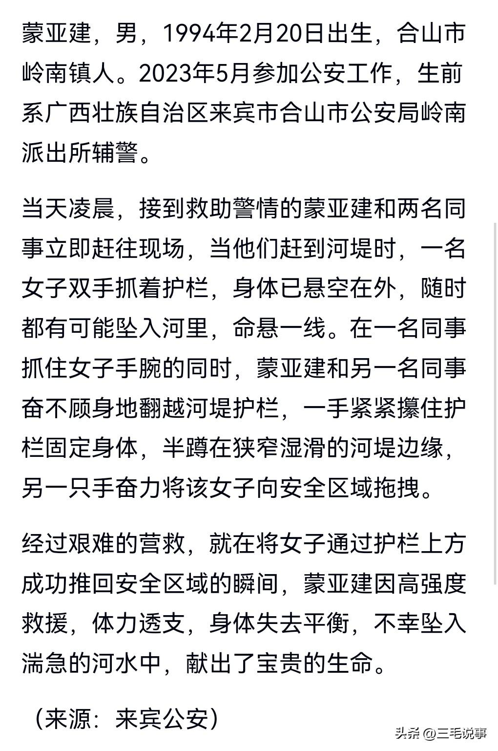 这真是太悲剧了,32岁辅警救轻生女子坠河牺牲。 人在任何时候都不要轻易放弃自己的生命。 千万不要做出轻生的举动。 3月22日凌晨4时30分许,广西来宾市合山市公安局岭南派出所辅警蒙亚建处置一起轻生群众救援警情时,奋不顾身地翻越河堤护栏营救轻生女子。 最终该名群众平安获救,蒙亚建却因高强度救援导致体力透支坠入湍急的河流不幸牺牲。 这真是太让人痛心了,这么年轻救人牺牲了。 也希望这名女子不要再做出轻生的举动,以慰救人英雄的在天之灵。