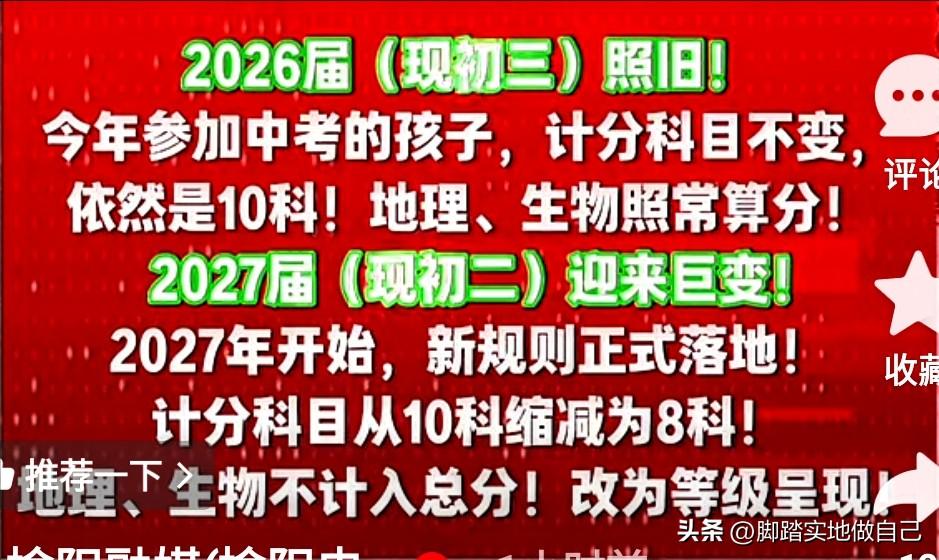 榆林家长速看!中考大改,2027年起这两科不算分了🔥 家人们,榆林教育局最新官宣!中考迎来重大调整,家里有初中生的赶紧码住,别等孩子备考才知道! ✅ 2026年(过渡年):还是10科计分,地生照常算分,实验、信息技术只看等级不计分 ✅ 2027年起(正式实施):直接精简到8科!语数英+物理+道法+化学+历史+体育,地理、生物彻底退出总分! ⚠️ 重点提醒:不是取消考试!地生照样考,只是按等级算,必须达到C级(合格)以上,再加上综合素质评价合格、总分过线,才能上普高! 陕西多地同步改革,就是为了给孩子减负,不用再全科目死磕,专心抓核心科目就行! 家里有初二、初一娃的,赶紧转发给身边家长,早知道早规划! 中考招生新规 多地中考新规 中考政策西安 中考会考时间 中考免考政策 京津冀中考改革 陕中考