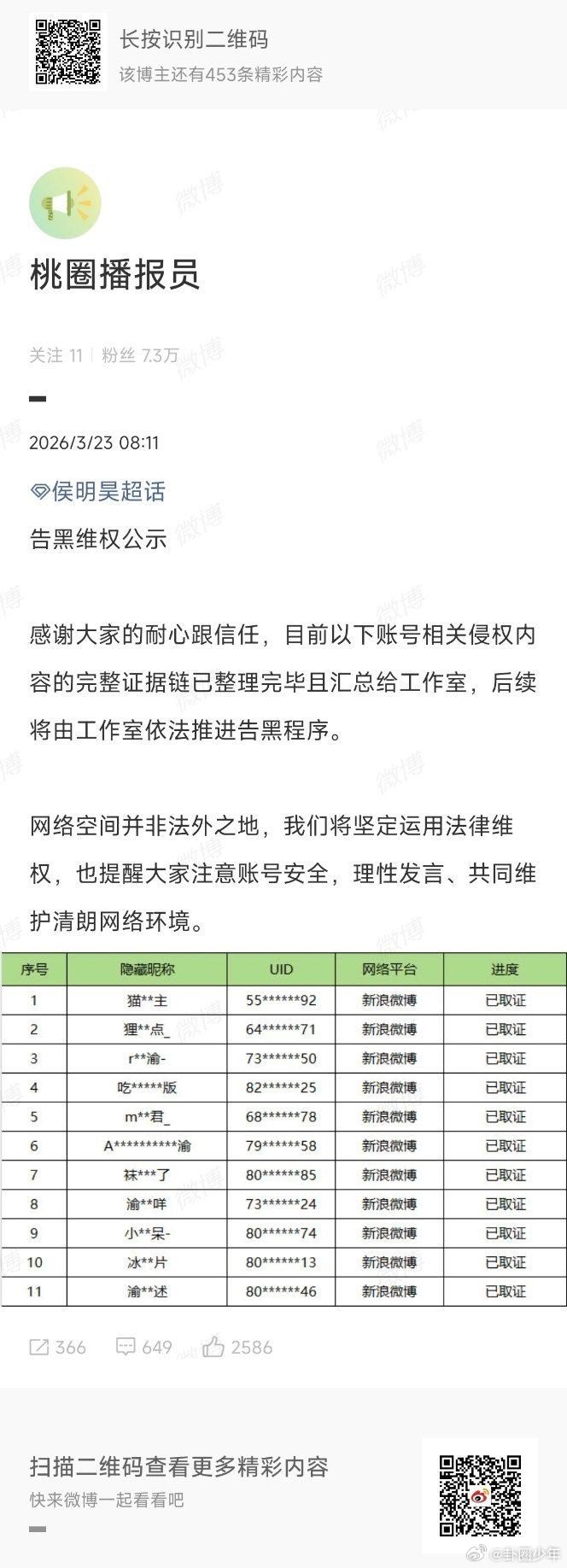 侯明昊告黑名单 不纵容恶意,不姑息谣言,支持侯明昊依法维权,对网络暴力零容忍。