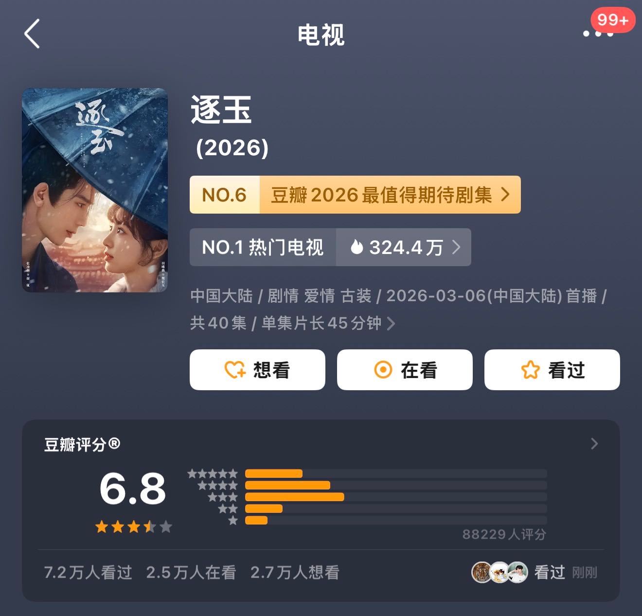 逐玉豆瓣6.8 青天大老爷呀~我们逐玉 也是不容易啊,一个古偶剧,被围剿一轮又一轮还能有6.8,猪猪🐷已经很厉害了!而且打分人数哪里少了,很多古偶不到五万人参与评分就开分了吧🤔补药对我们猪猪🐷这么苛刻啊!掌上明逐们俺们还是专注追剧吧~