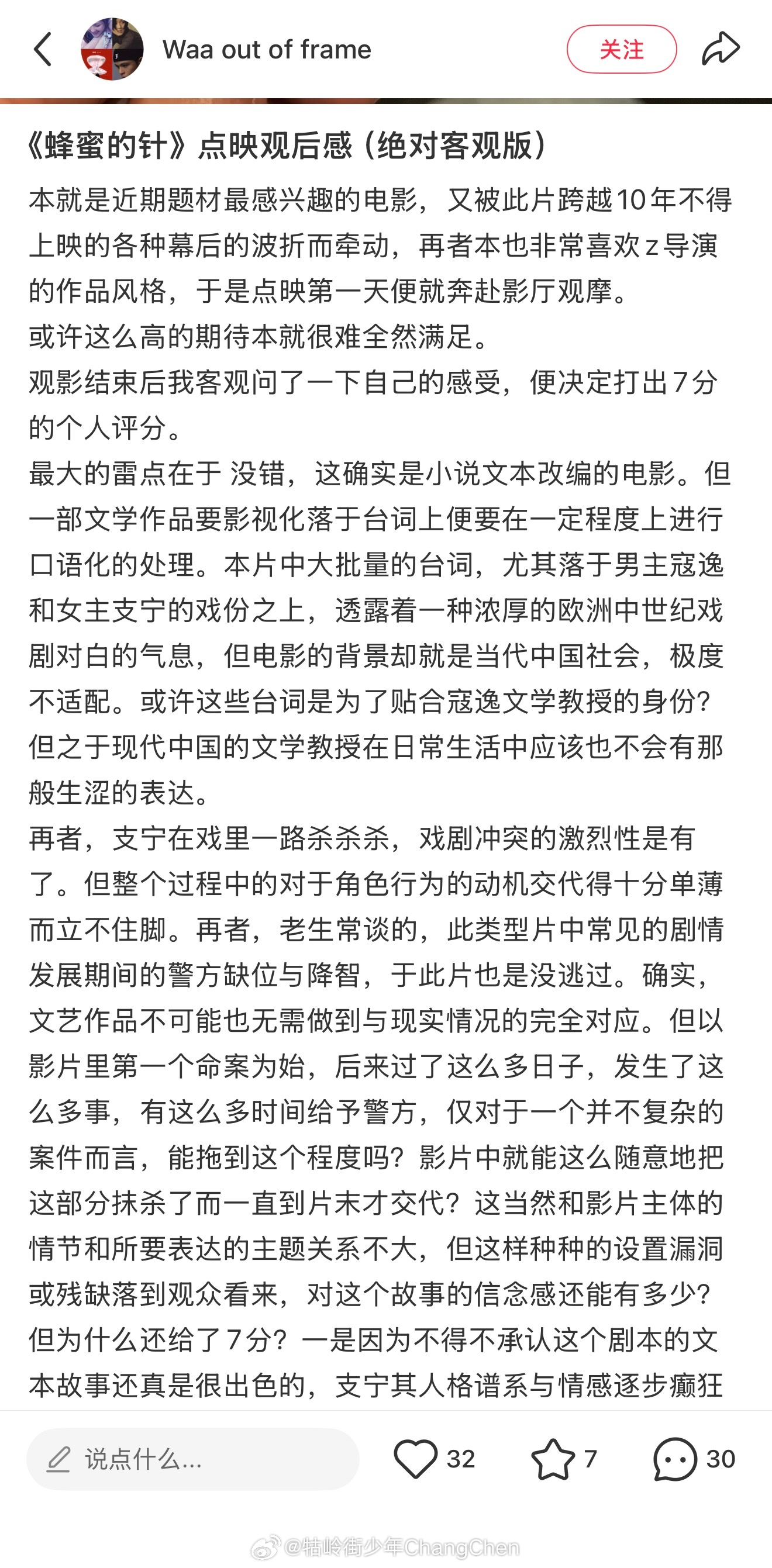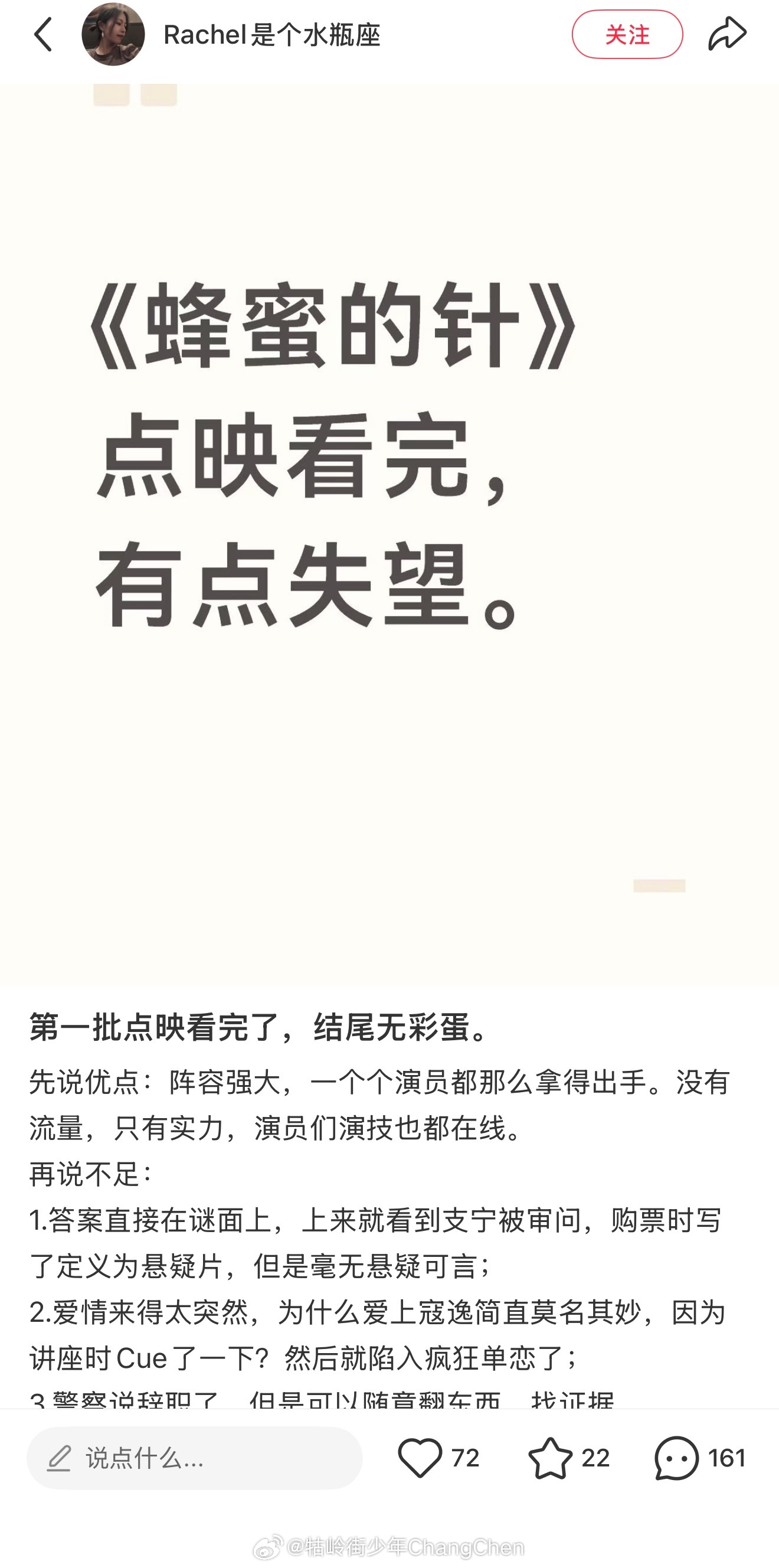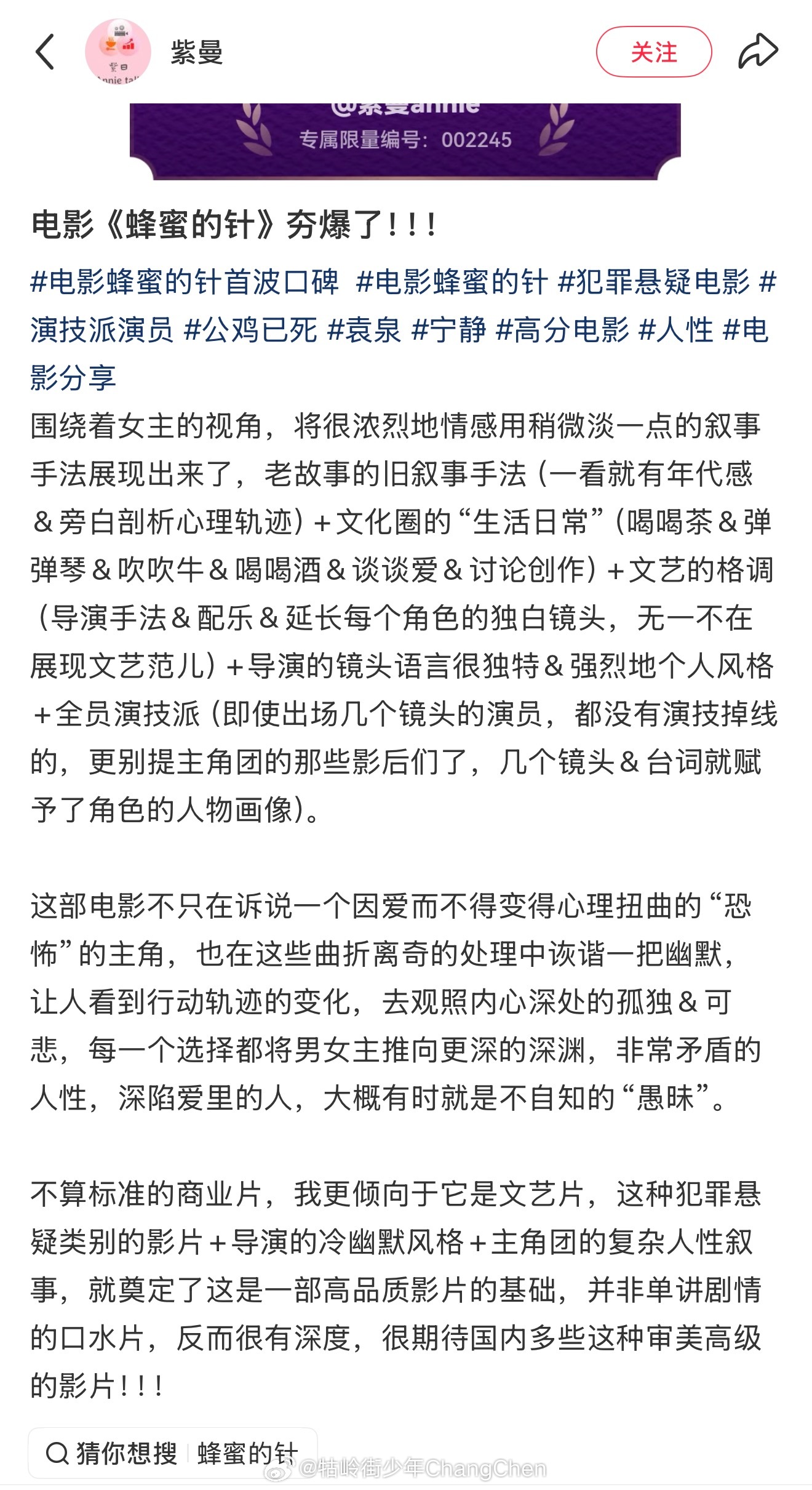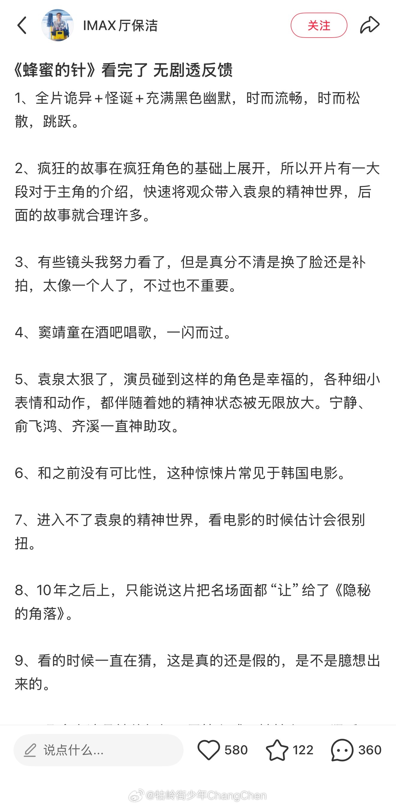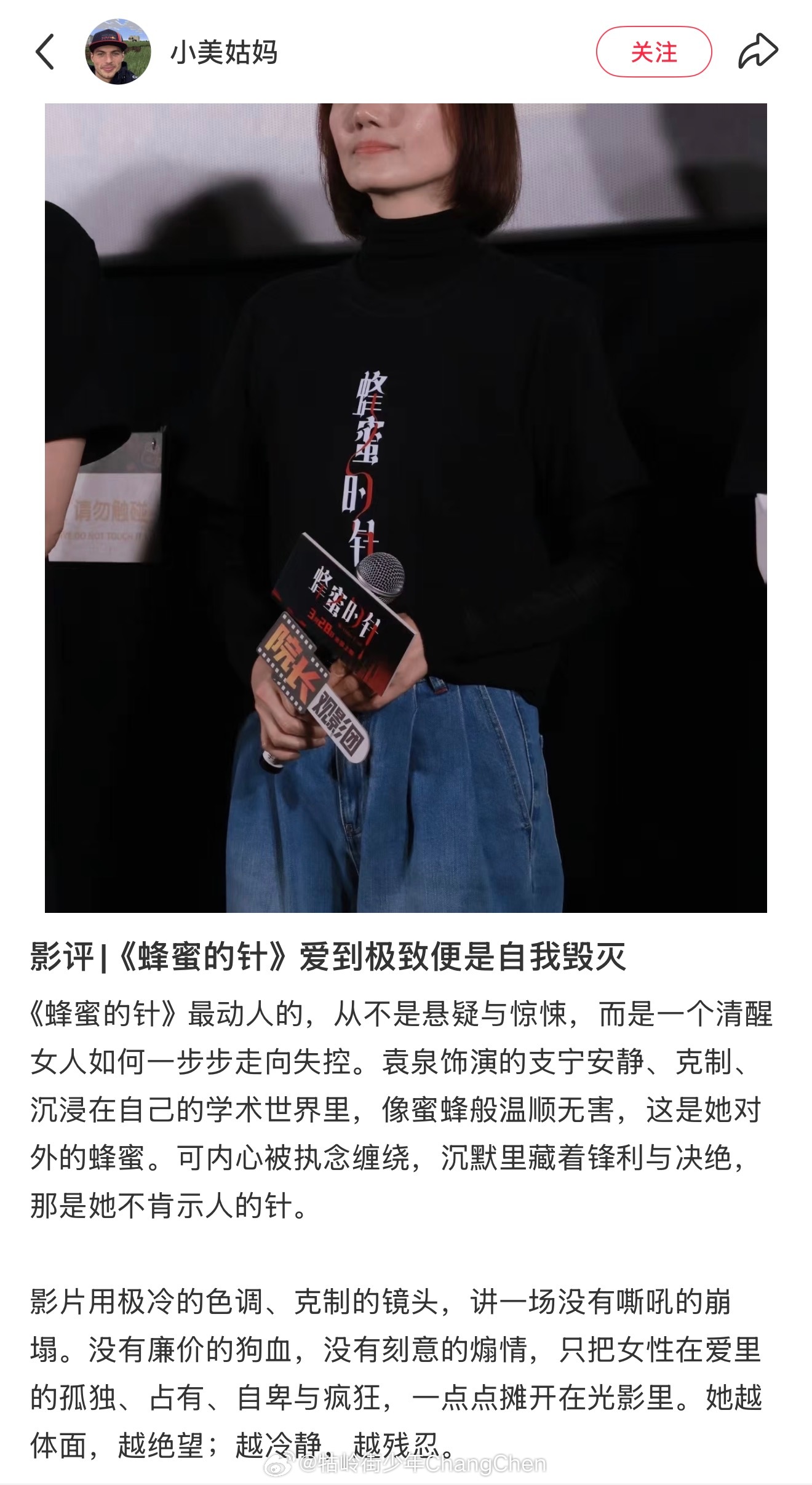 袁泉、耿乐、宁静、俞飞鸿、齐溪、孙悦、陈冲、史可、余皑磊主演的《蜜蜂的针》repo:有人很喜欢,也有人表示失望,毕竟是十年前拍的电影。
