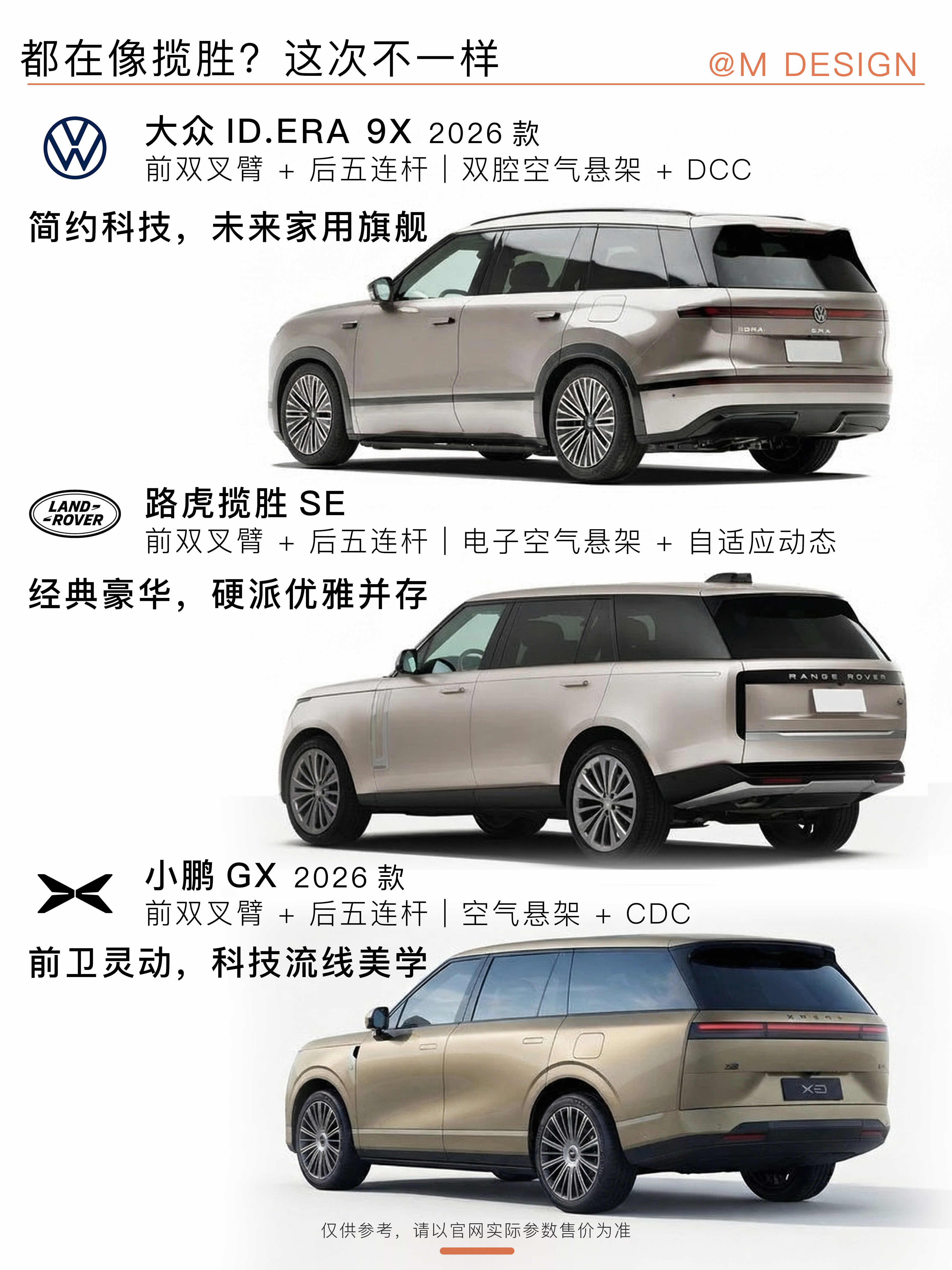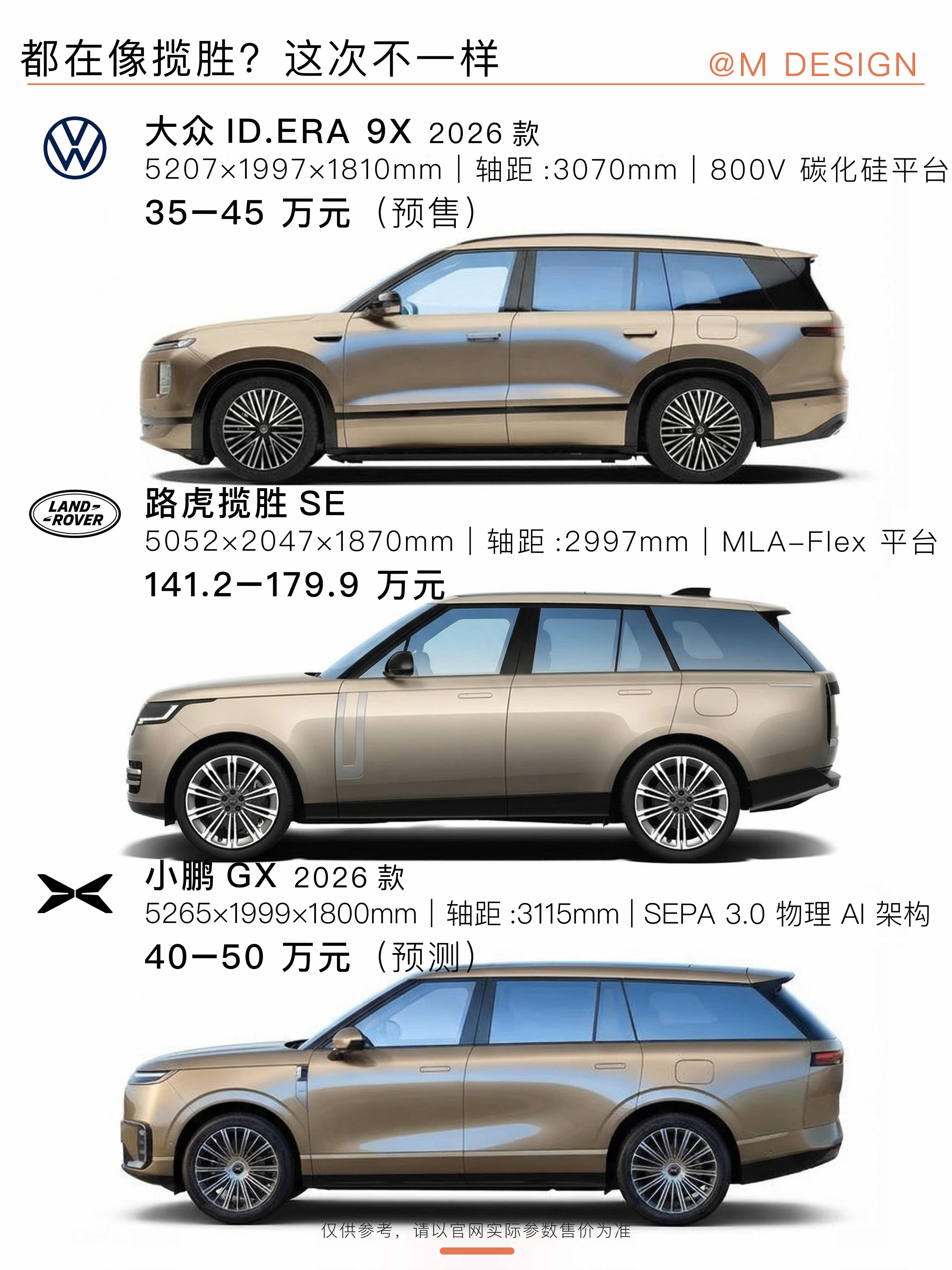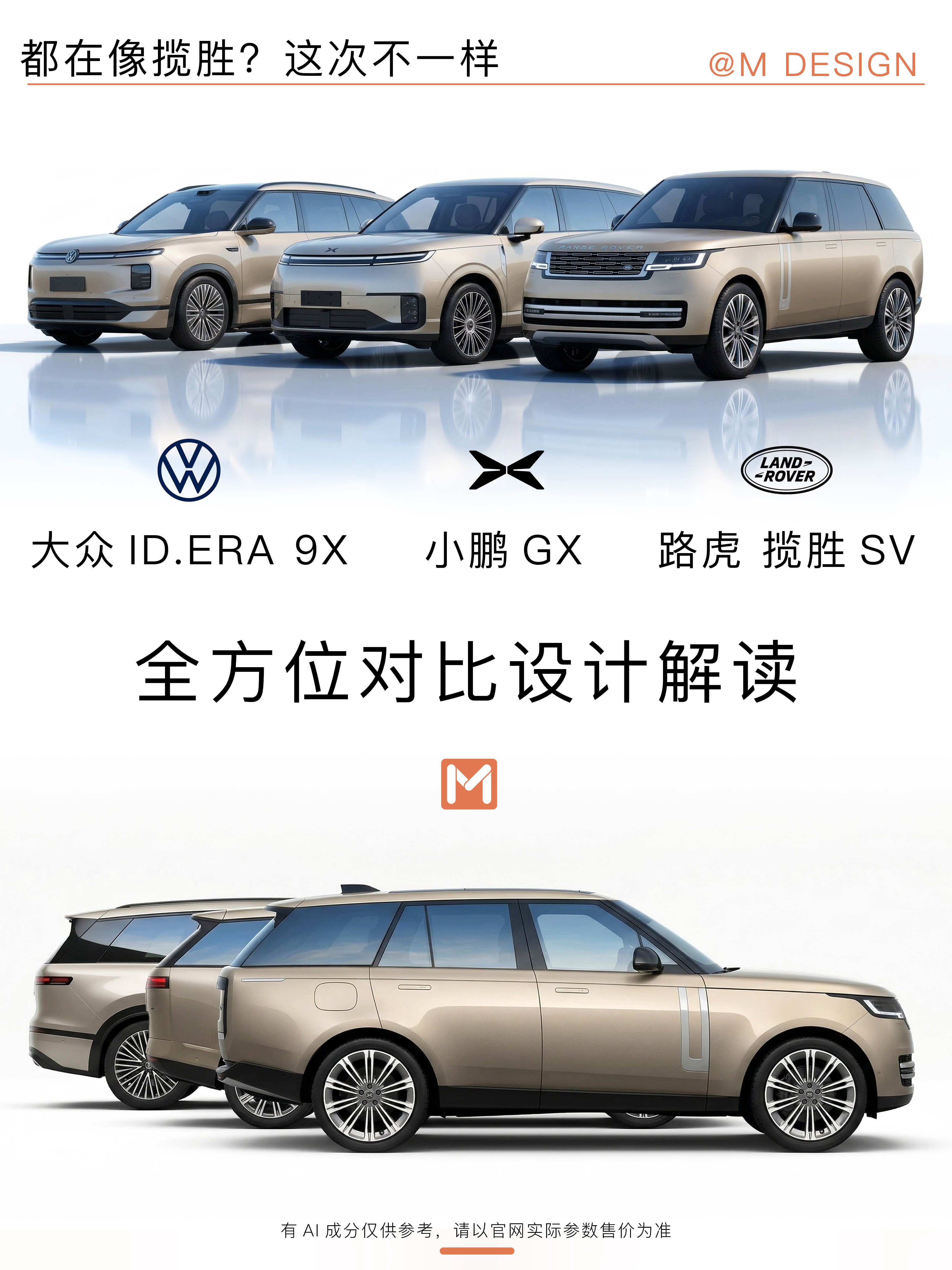 最近看完大众ID.ERA 9X、路虎揽胜SE和小鹏GX,一个很直观的感受:大SUV的“答案”,几乎都写在揽胜那本教科书里。 先说ID.ERA 9X,它不是简单复刻揽胜,而是把“德系秩序感”套进了揽胜的比例逻辑:更克制的面、干净的体块、极少装饰。设计优势在于高级感来得很轻松,甚至有点像把豪华做成了理性产品,适合那种不想张扬但又要体面的用户。 小鹏GX则更“互联网理解”:同样的方正比例+高车头,但细节更锋利,灯带、切面更强调科技表达。它借的是揽胜的“壳”,但填进去的是智能时代的情绪——更年轻,也更容易被第一眼记住。 而揽胜SE本身,依然是那个“比例怪物”:短前悬、平直腰线、悬浮车顶,这些并不新,但组合在一起就是气场。它的优势不是设计多复杂,而是几乎没有多余动作——越简单越难被超越。 为什么大家都在“像”?本质是用户对大SUV的心理预期已经被揽胜定义:要稳、要高、要有掌控感。这是一种视觉上的安全感,也是身份表达的最低成本路径。ID.ERA 9X和小鹏GX选择这条路,本质是降低理解门槛,加快市场接受速度。 但这对营销是双刃剑:好处是“看起来就很贵”,坏处是品牌辨识度容易被吞没。尤其对新品牌来说,短期好卖,长期要回答“你到底是谁”。 用户层面也很清晰:揽胜SE是成熟审美+社会地位的象征;ID.ERA 9X更偏理性中产,对设计有要求但不爱张扬;小鹏GX则是新中产和科技控,愿意为“新鲜感+智能感”买单。 说到底,揽胜被不断借鉴,不是因为它有多“好看”,而是它太“正确”。