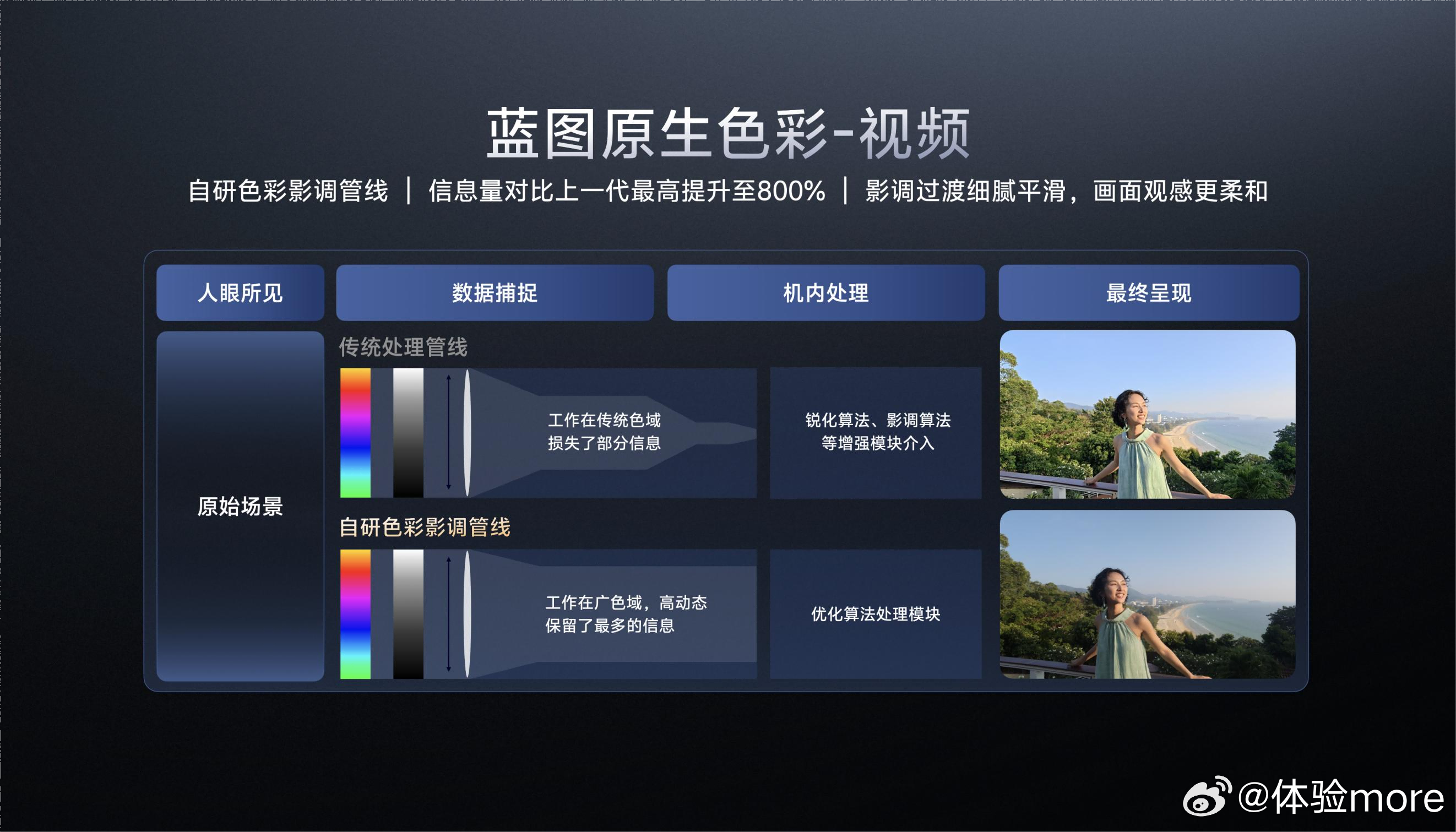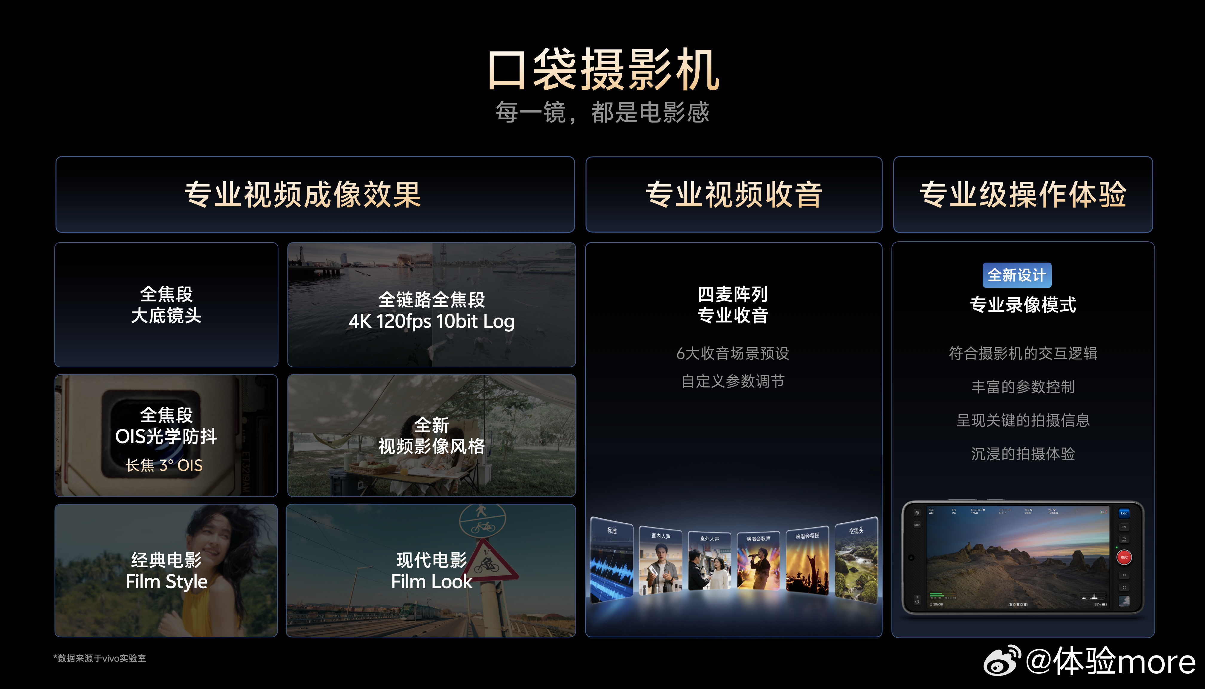 除了拍照,这次定位口袋摄影机,视频提升也很大。蓝图原生色彩也支持视频。vivo 有史以来最强四麦阵列专业收音,和全新设计的专业录像模式。vivo X300 Ultra专业V单
