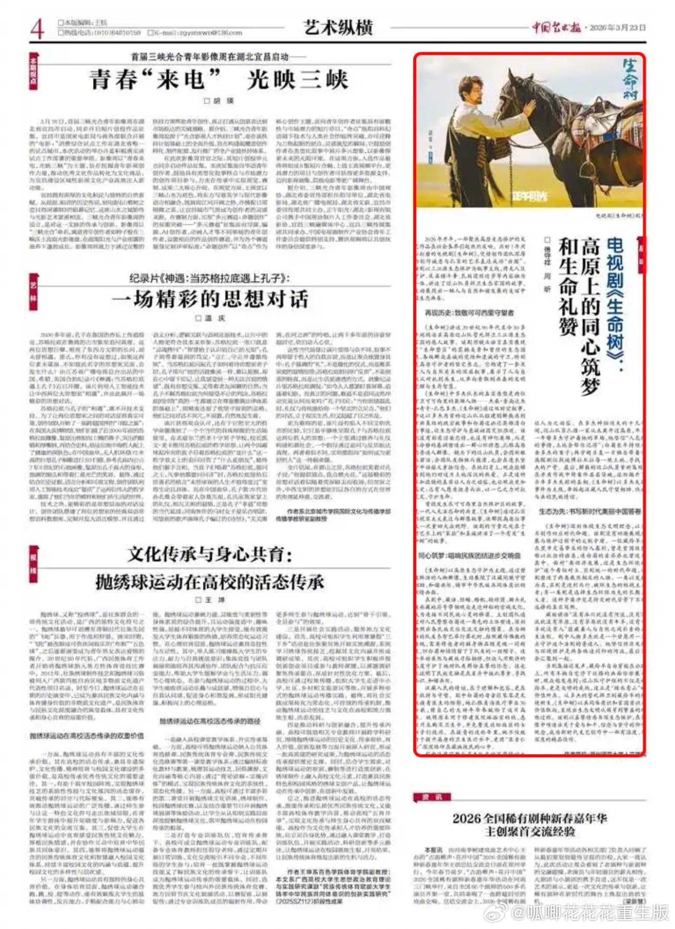 中国艺术报评生命树:高原上的同心筑梦和生命礼赞】历时7年用心打磨的电视剧《生命树》,凭借创作团队深厚的创作诚意与扎实的艺术表达成功“出圈”,生动展现出一幅人与自然和谐发展的美丽中国生态画卷!!!都是官媒带头夸,嘿子又着急了,我看有好多又坐不住了,又在说杨紫承包报纸了!