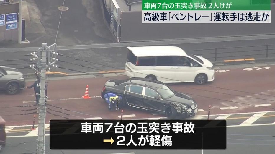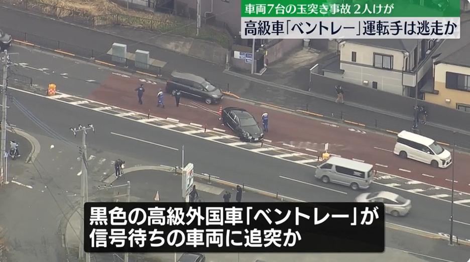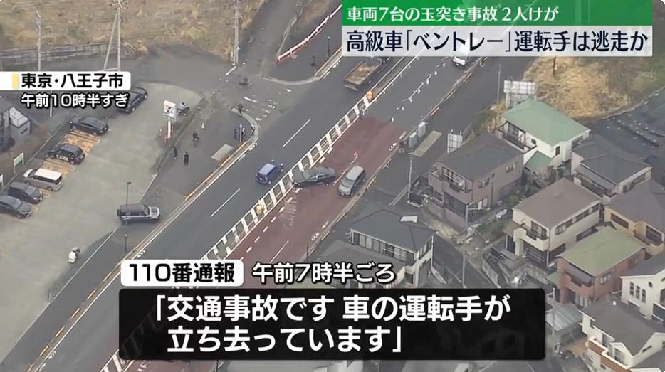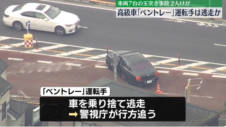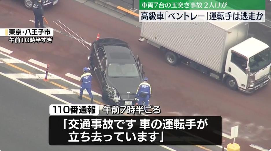 今晨东京八王子街头宾利车肇事逃逸 今天早晨7点半左右,东京八王子市发生一起涉及七辆车的连环事故,两人轻伤。 肇事车辆司机已逃离现场,东京警视厅正以肇事逃逸进行追踪。 上午7:30左右,八王子市晓町的国道上,一辆黑色豪华宾利与前方车辆追尾,发生连环相撞事故,七辆车中部分损坏严重,无法自行驶离。 在这起事故中,两人被送往医院,一名50多岁的女性乘坐的车被宾利撞击,另一名50多岁的男子坐在前面的卡车上,两人均受轻伤。 事故发生后,宾利司机丢弃车辆逃跑,宾利的右前部严重受损。 东京警方正在追查司机行踪。 案发地点位于中央高速公路和八王子立交以西约1公里处,周围分布着住宅和商店。