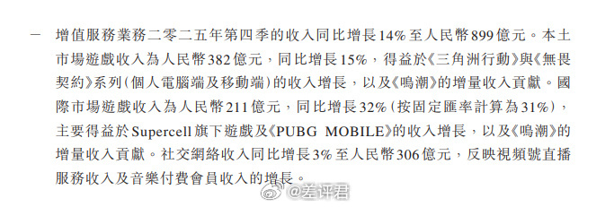 #腾讯海外游戏收入首次突破100亿美元# 上次说腾讯财报里,洲很赚钱,那今天具体说说游戏业务。2025年全年,腾讯游戏业务总收入达到了2416亿元,同比增长高达22%。这里面本土市场全年收入1642亿元,上涨了18%。除了《王者荣耀》、《和平精英》这些国民游戏,新爆款《三角洲行动》以及《无畏契约》系列(端游+手游)还有《鸣潮》带来的拉动也相当明显。