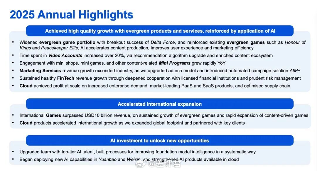 而在国际市场,2025年的腾讯在国际市场游戏更是创下历史新高,年收入首次超越100亿美元大关。这里面Q4单季更是拿下了211亿元,同比暴涨32%!除了长青树《PUBG MOBILE》之外,腾讯还单独点名《鸣潮》的贡献功不可没。