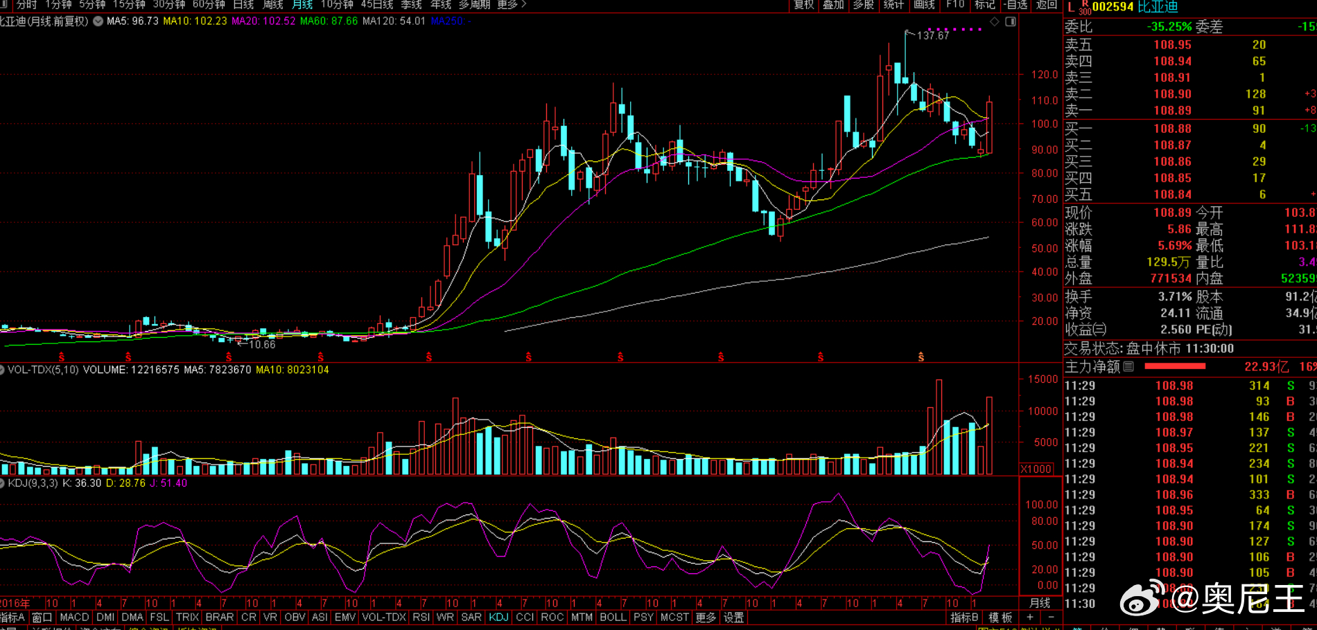 比亚迪A股大涨 放量之后能不能站稳250日均线?月线周线都是处线反弹!