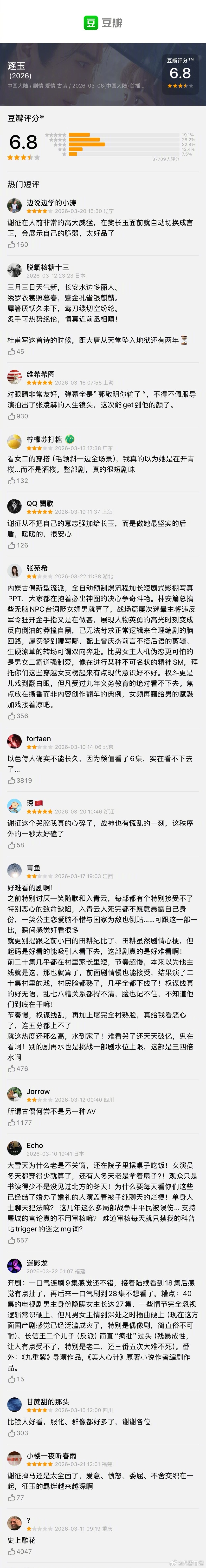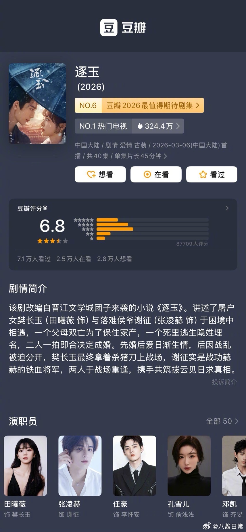 张凌赫、田曦薇《逐玉》豆瓣开分6.8分