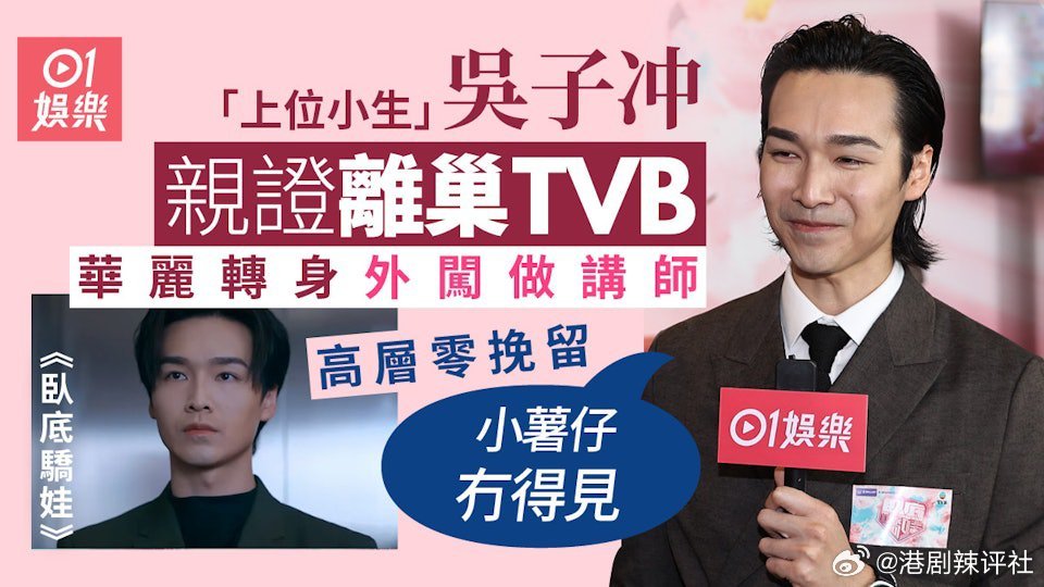 昨日(3月22日)吳子冲出席《臥底驕娃》宣傳活動,他接受《香港01》訪問時親證離巢,表示是和TVB「和平分手」及透露離巢後向去。當被問到TVB高層有沒有挽留他時,他笑言:「好耐冇見到樂小姐、珍姐。」