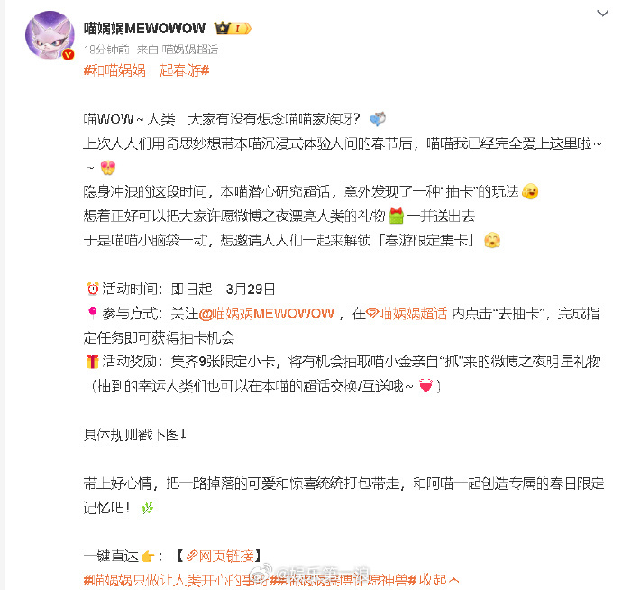 和喵娲娲一起春游 Ta来了!Ta来了!带着礼物又来了!大咖签名照、签名星云图、明星限定漫画等快来集卡抽奖戳链接一起抽卡玩起来👉:【网页链接】