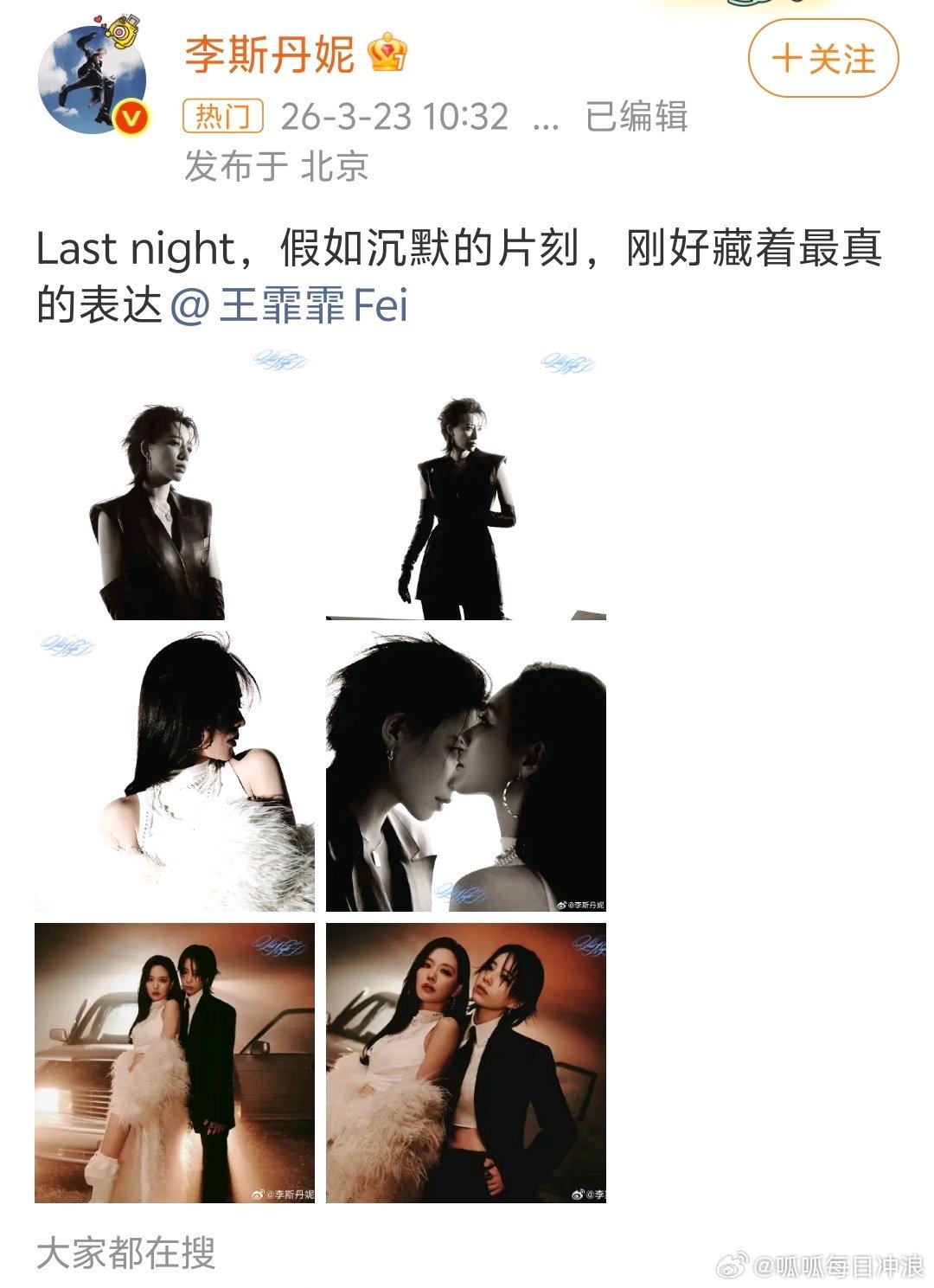 李斯丹妮王霏霏错位合照李斯丹妮和王霏霏的错位合照,一个角度,一次定格,黑白色调把氛围感拉到极致,两人同框又飒又有故事感。两位姐姐欢迎是真的好啊,last night~